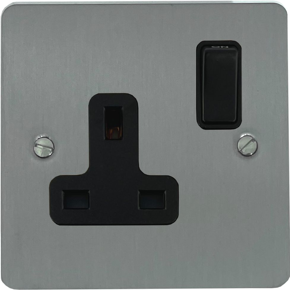 Flat Brushed Steel Single Socket (Black Switch) - G+H FSS9B