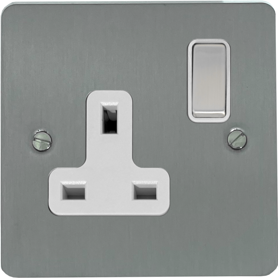 Flat Brushed Steel Single Socket (White Insert/Satin Chrome Switch) - G+H FSS209