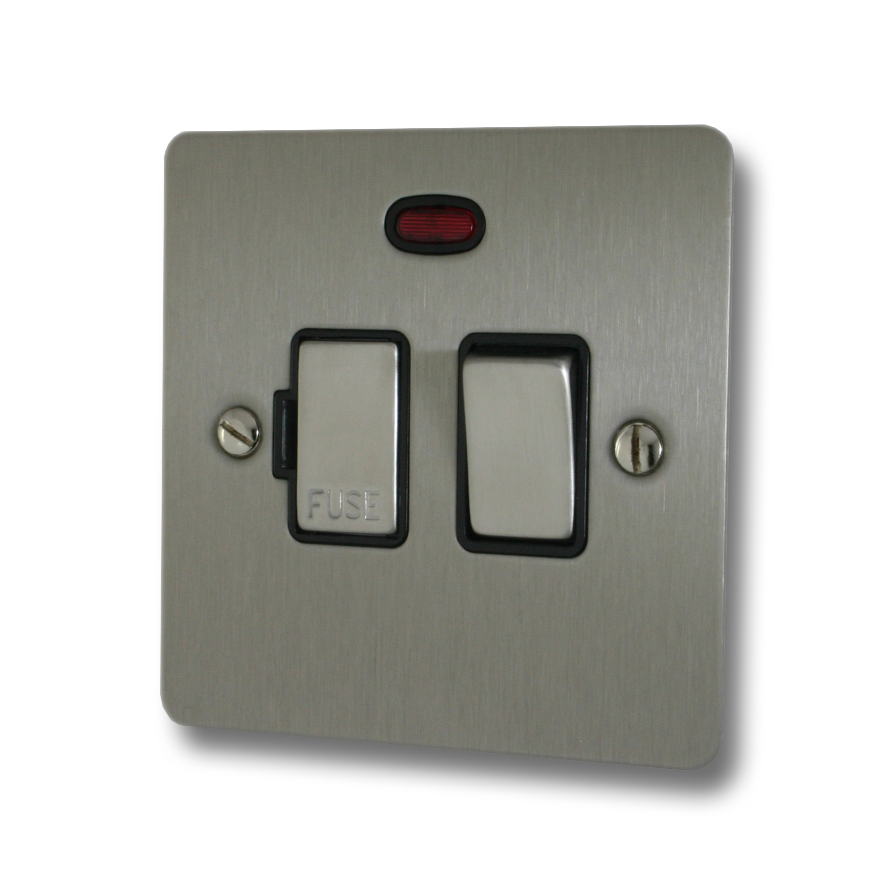 Flat Brushed Steel Switched Fused Spur with Neon (Black Insert/Satin Chrome Switch) - G+H FSS327