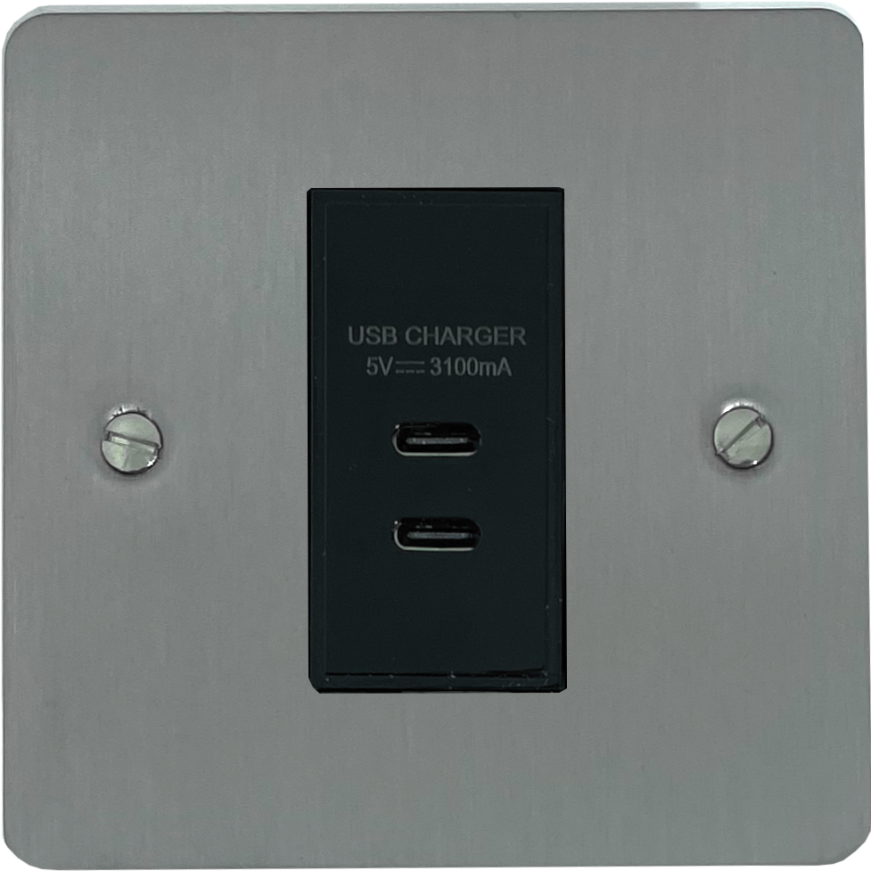 Flat Brushed Steel USB Charger (2x USB-C) (1 Gang/Black Insert) - G+H FSS42B