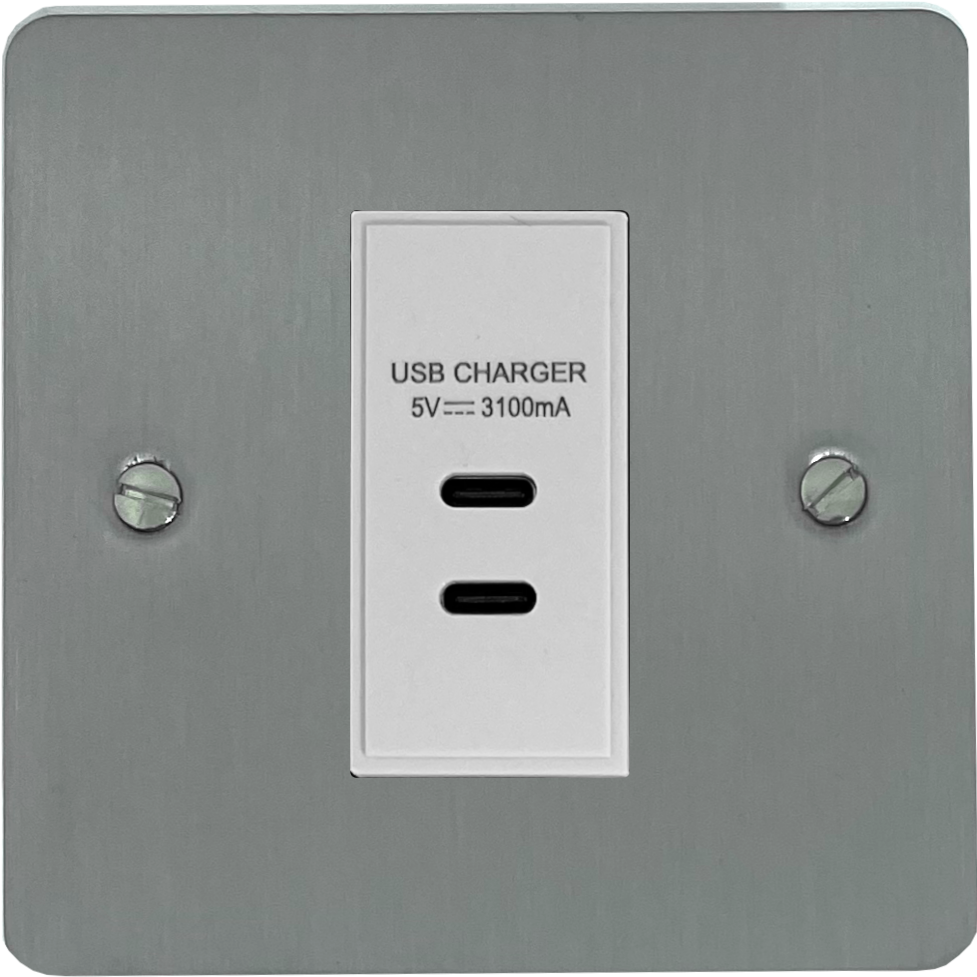 Flat Brushed Steel USB Charger (2x USB-C) (1 Gang/White Insert) - G+H FSS42W