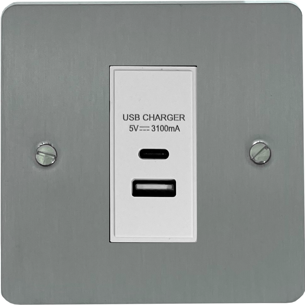 Flat Brushed Steel USB Charger (USB-A and USB-C) (1 Gang/White Insert) - G+H FSS41W