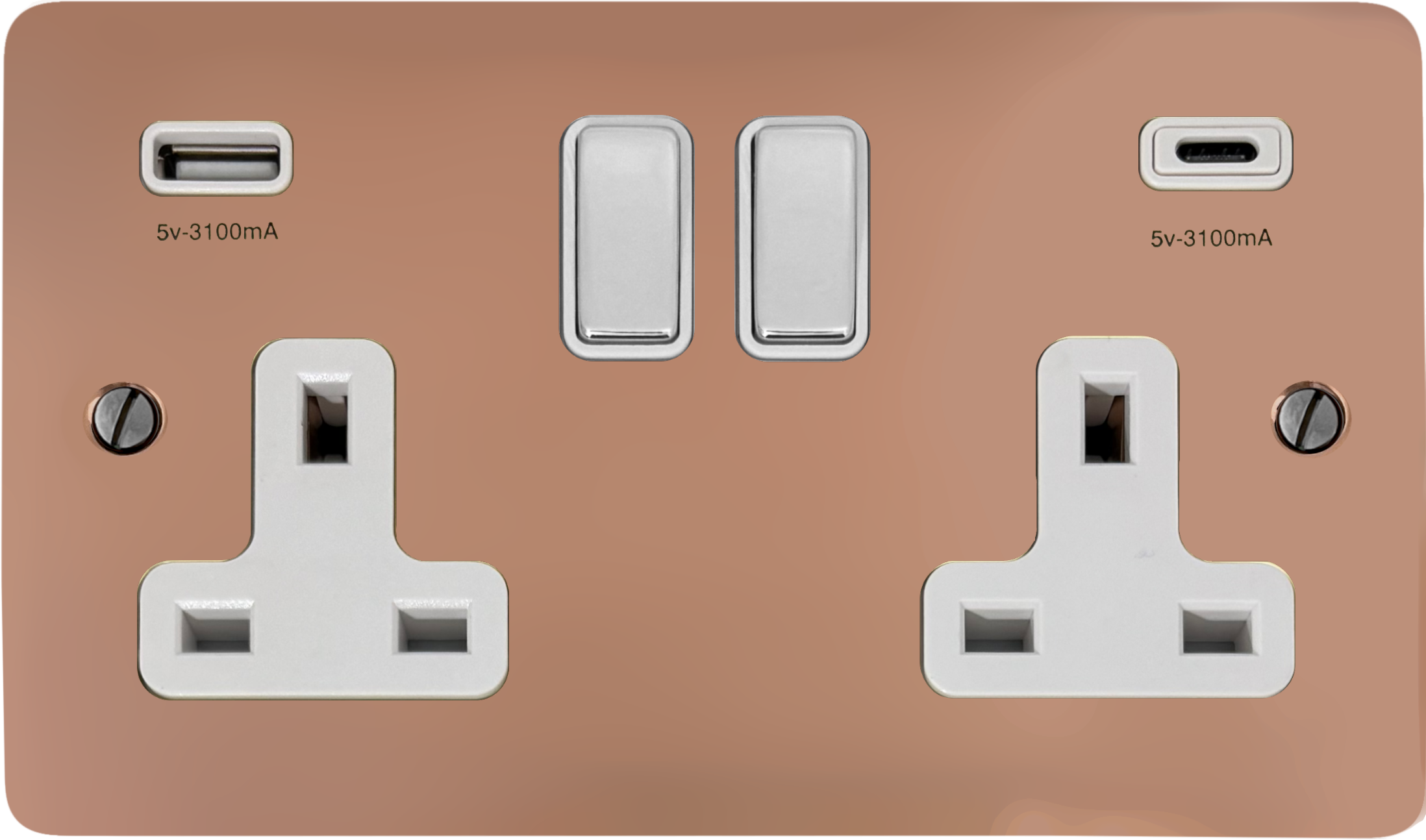 Flat Copper Double Socket with USB (USB-A and USB-C/Polished Chrome Switches) - G+H FBC2911