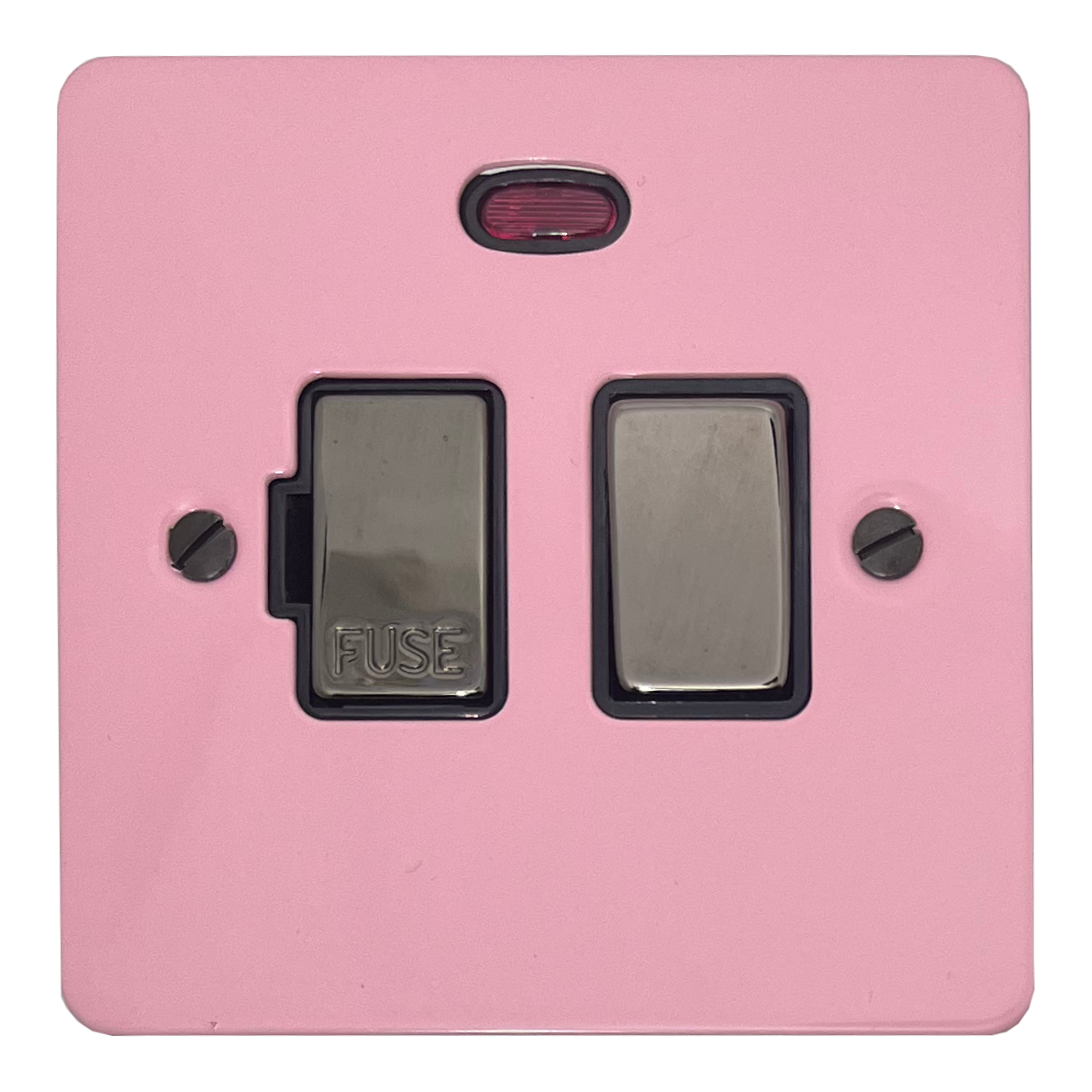 Flat Gloss Pink Switched Fused Spur with Neon (Black Insert/Antique Brass Switch)