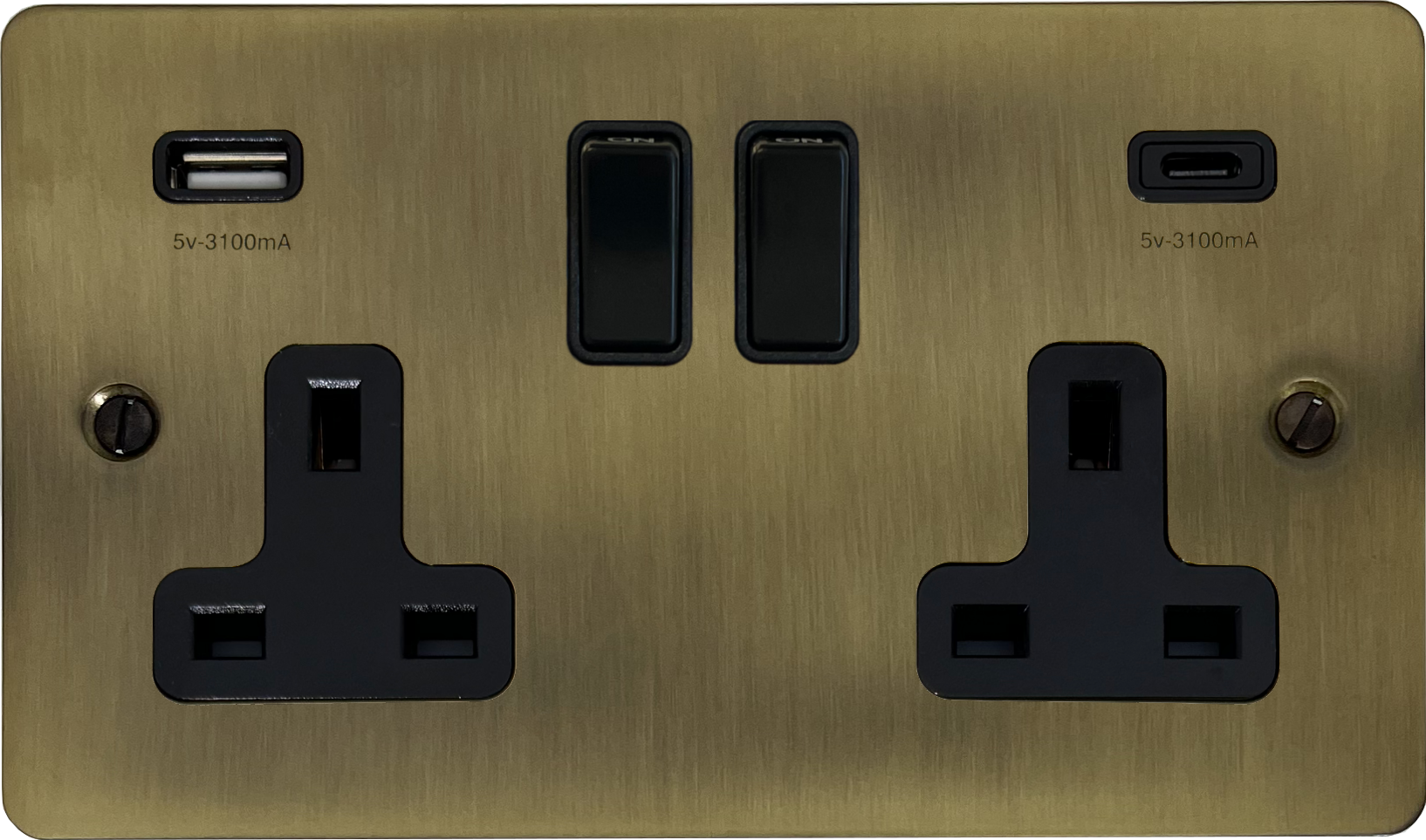 Flat Light Antique Brass Socket with USB (2 Gang/USB-A and USB-C/Black Switches) - G+H FLAB911B