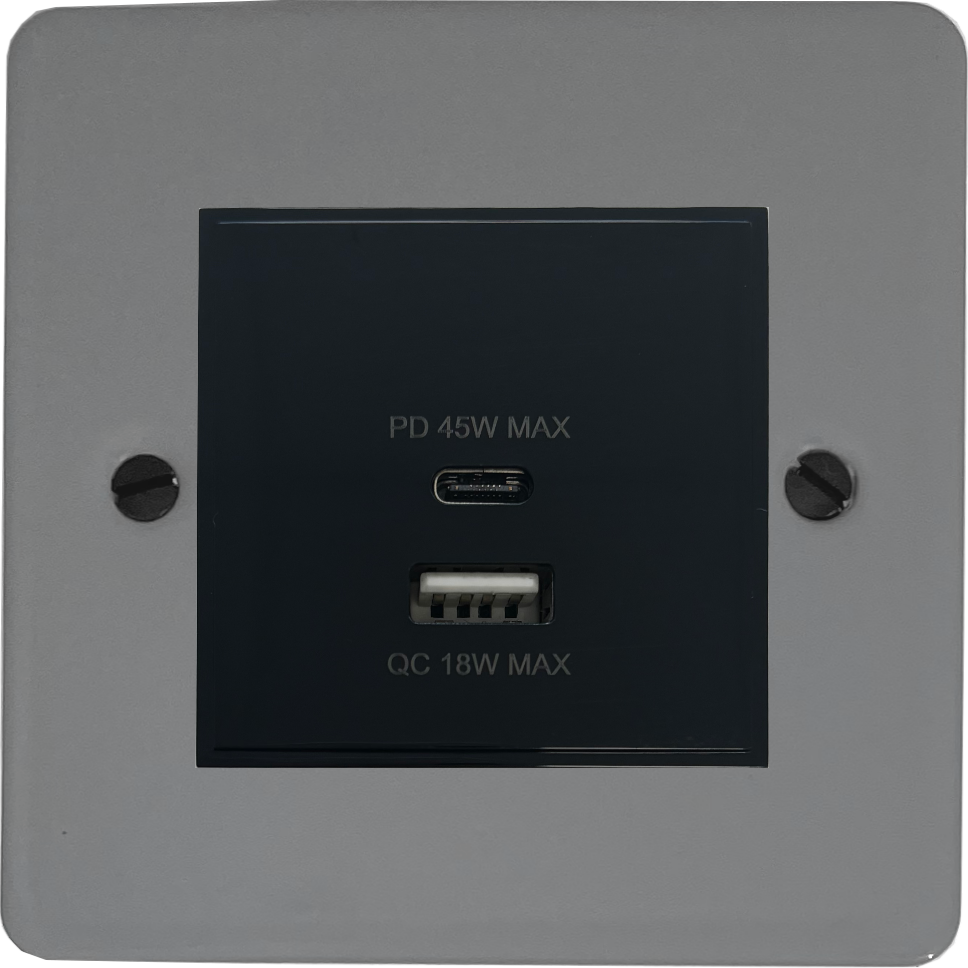 Flat light grey USB Charger (Dual USB A + C Quick Charge) (Black Insert/1 Gang) - G+H FLG43B
