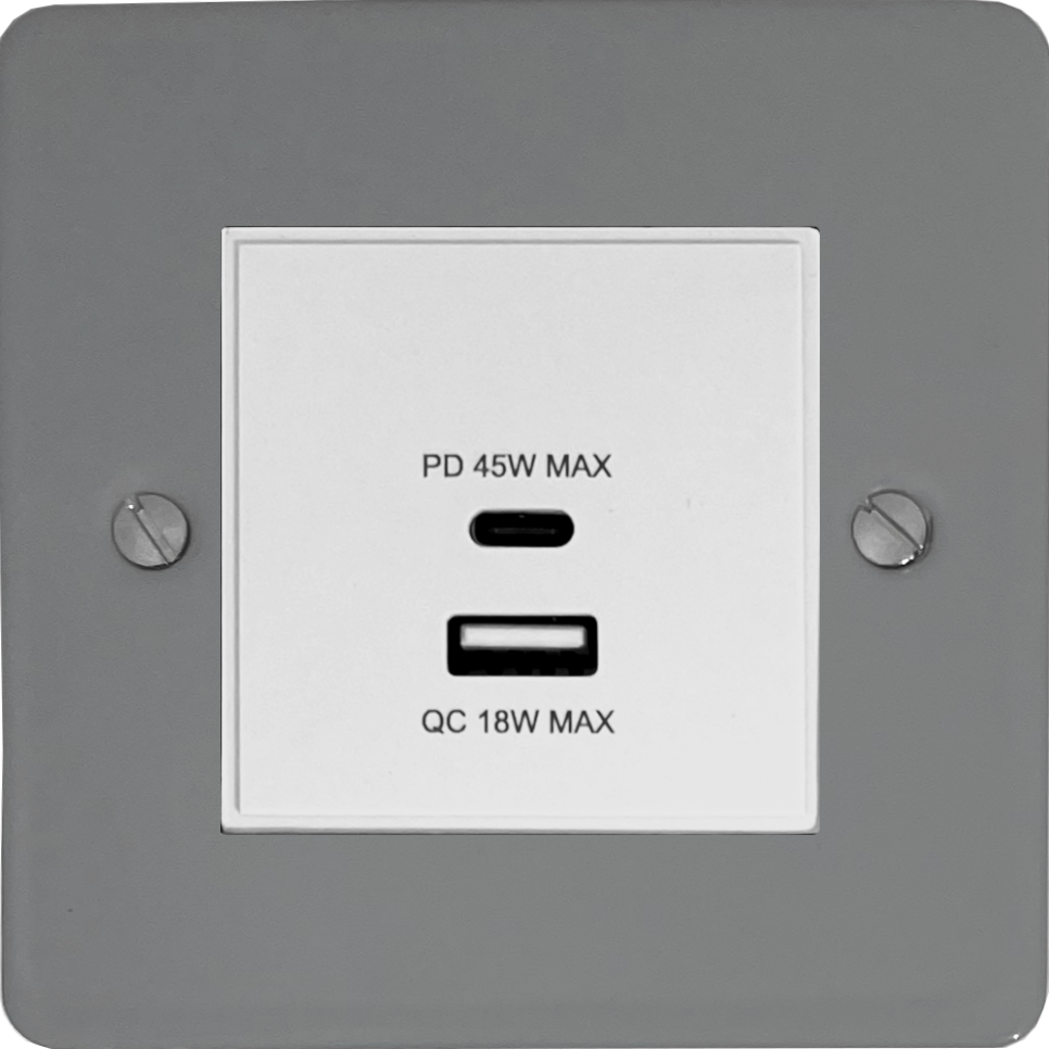 Flat light grey USB Charger (Dual USB A + C Quick Charge) (White Insert/1 Gang) - G+H FLG43W