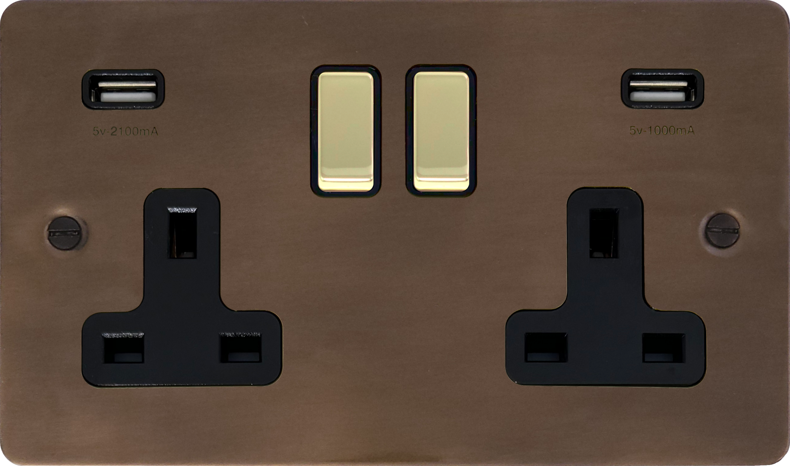 Flat Medium Bronze Double Socket with USB (Black Inserts/Polished Brass Switches)
