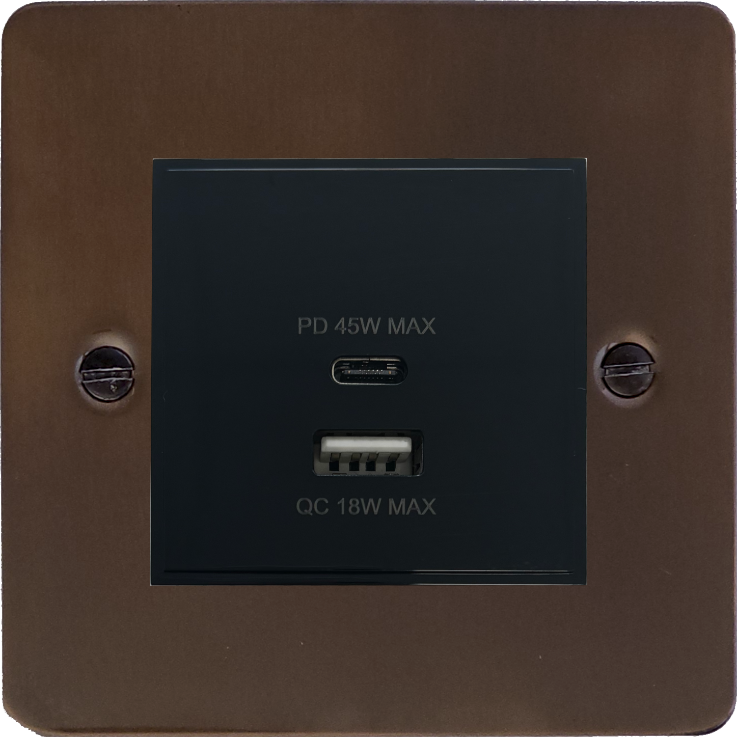 Flat Medium Bronze USB Charger (Dual USB A + C Quick Charge) (1 Gang)