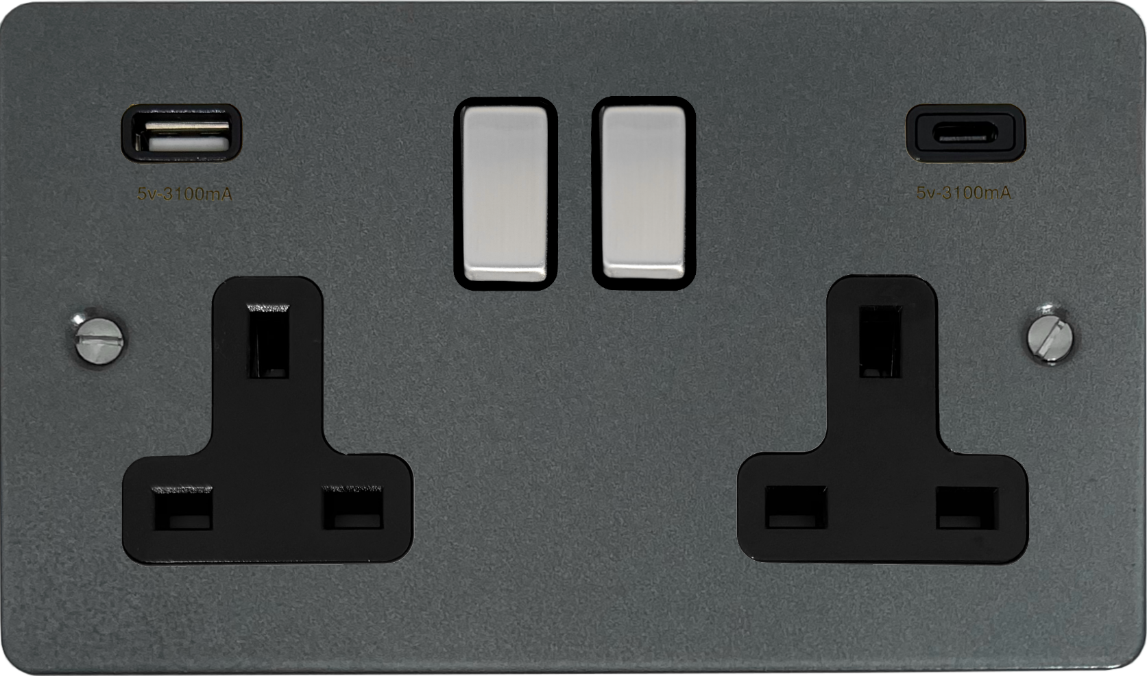 Flat Pewter Double Socket with USB (2 Gang/USB-A and USB-C/Black Insert/Steel Switches)