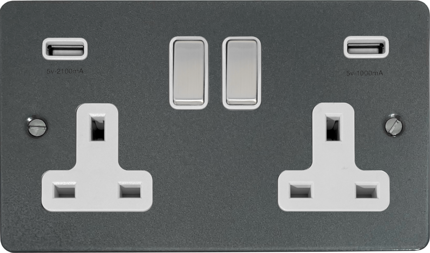 Flat Pewter Double Socket with USB (White Insert/Steel Switches) - G+H FP2910