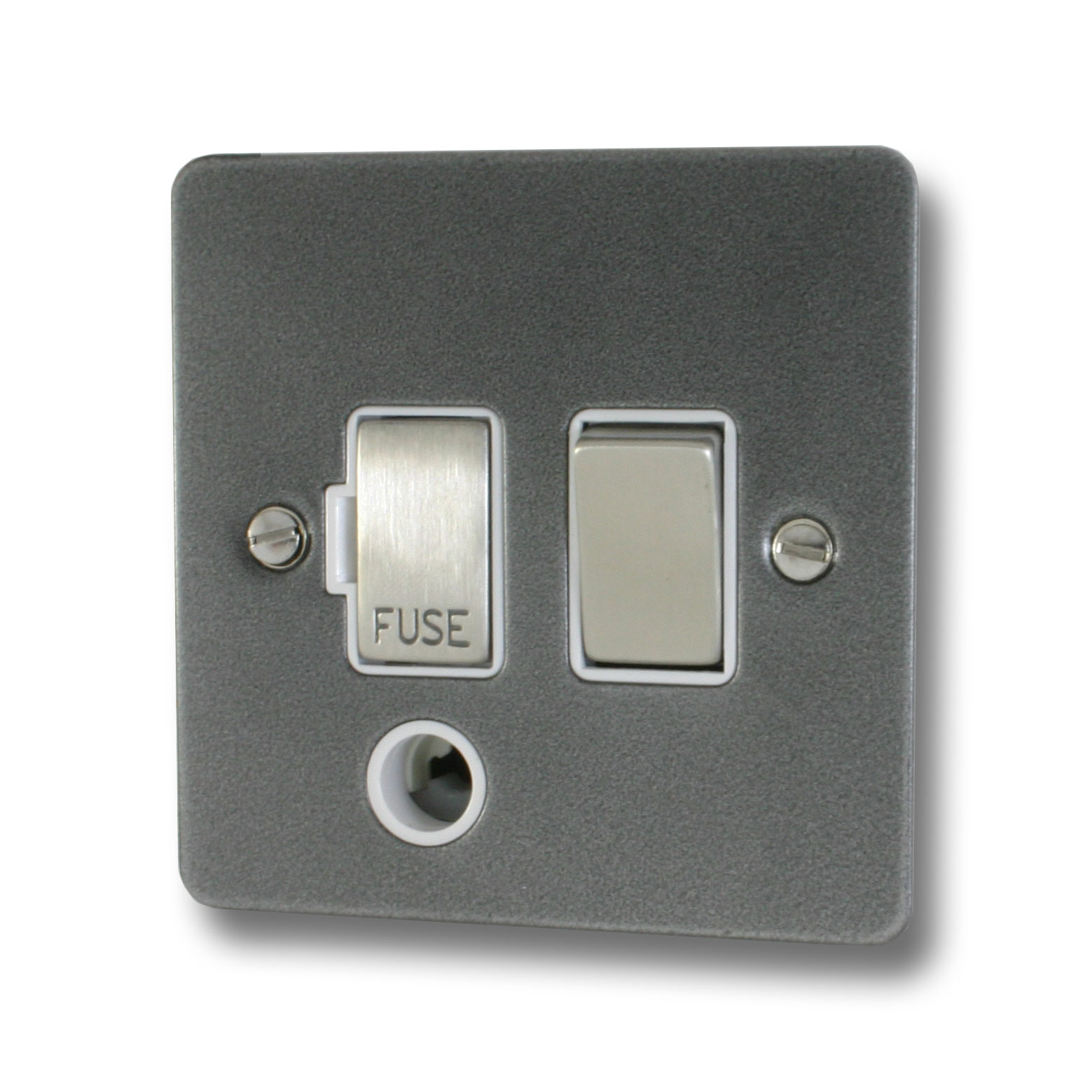Flat Pewter Switched Fused Spur with Flex Outlet (White Insert/Satin Chrome Switch)