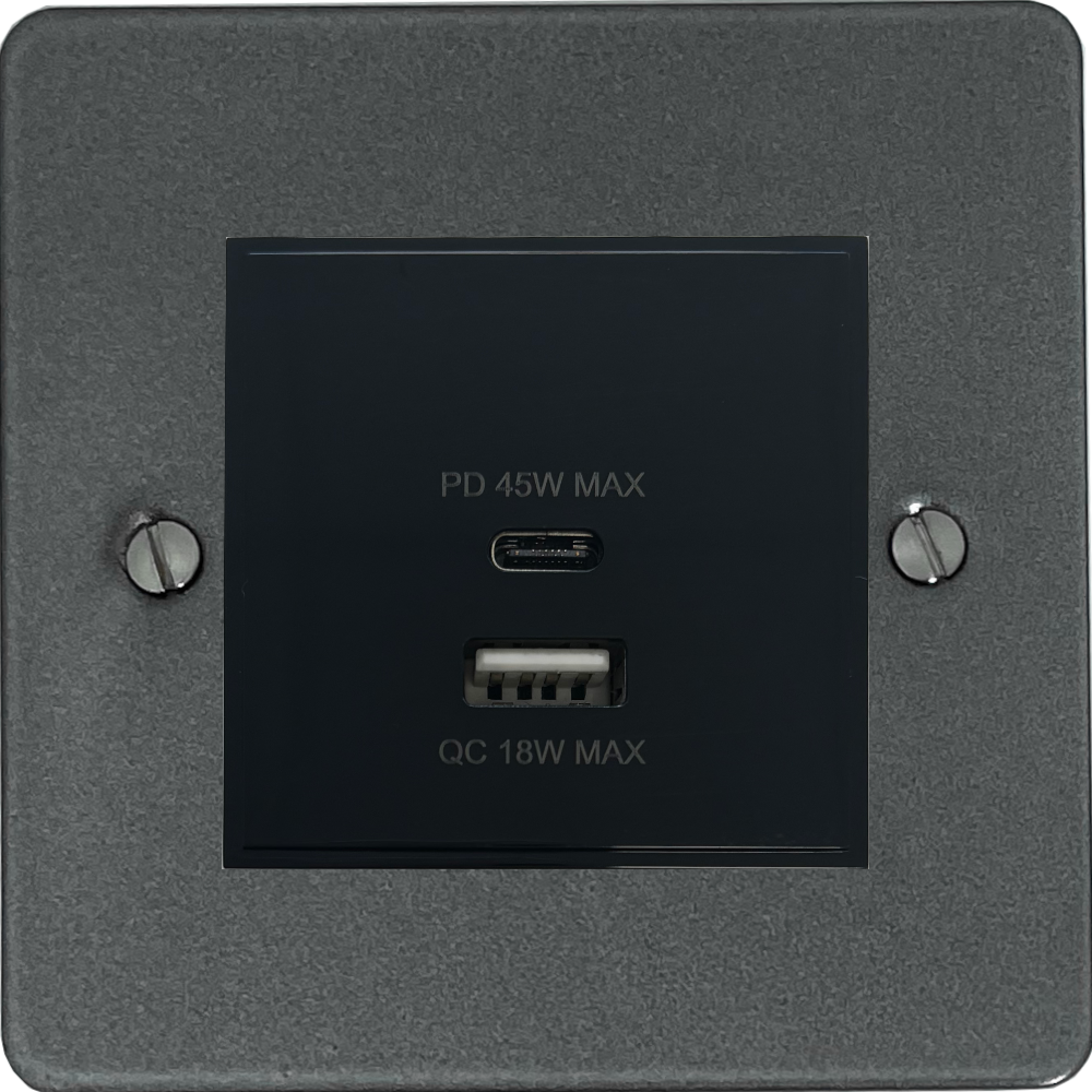 Flat Pewter USB Charger (Dual USB A + C Quick Charge) (1 Gang/Black Insert) - G+H FP43B