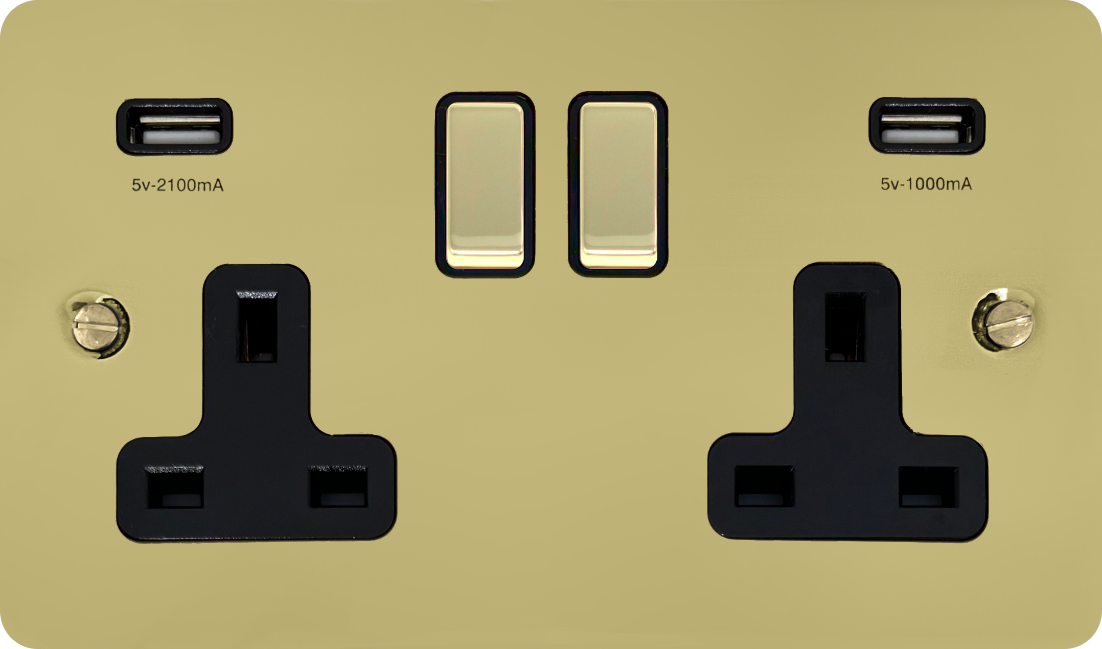 Flat Polished Brass Double Socket with USB (Brass Switches) - G+H FB3910