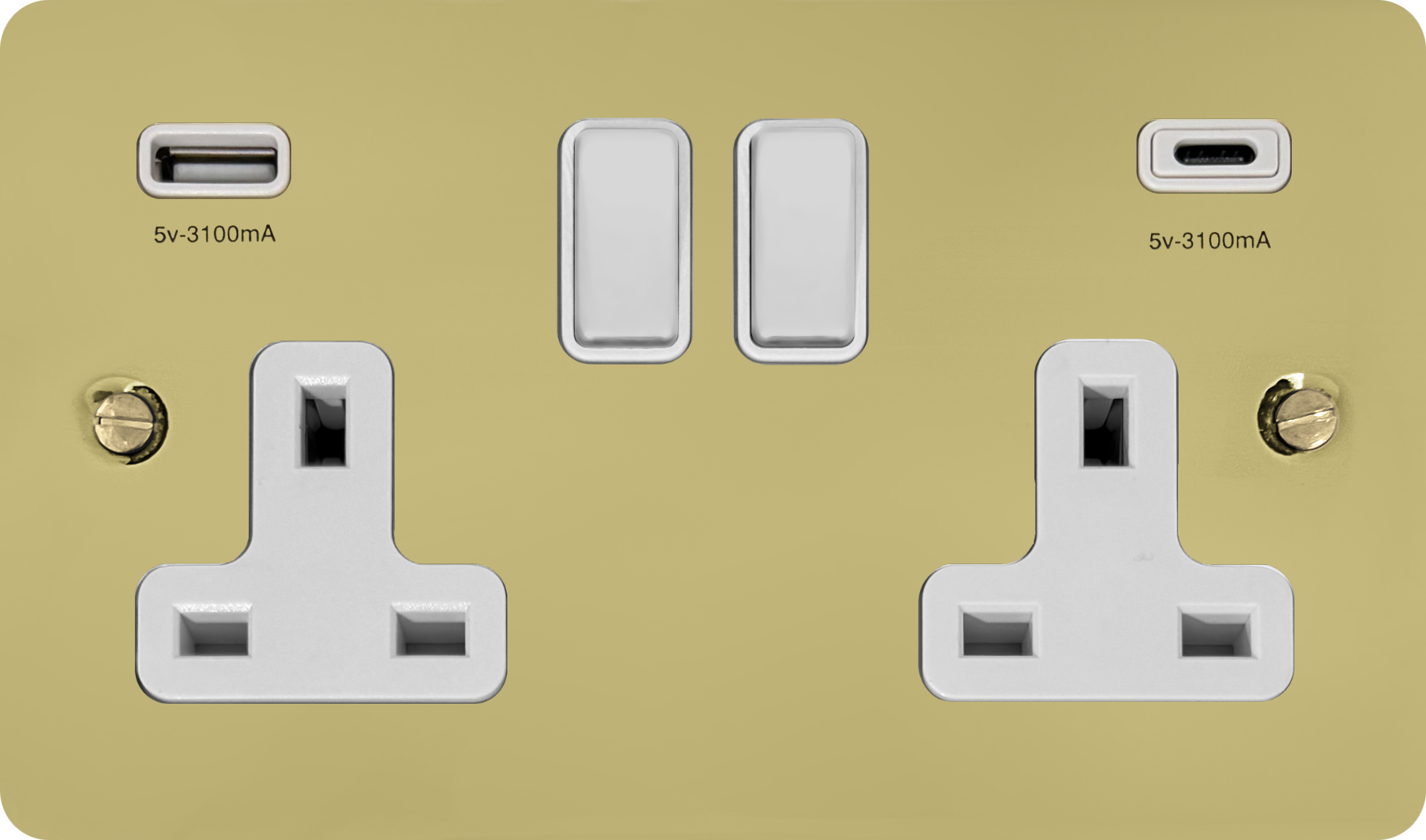 Flat Polished Brass Hand Waxed Double Socket with USB (USB-A and USB-C/White Switches) - G+H FHX911W
