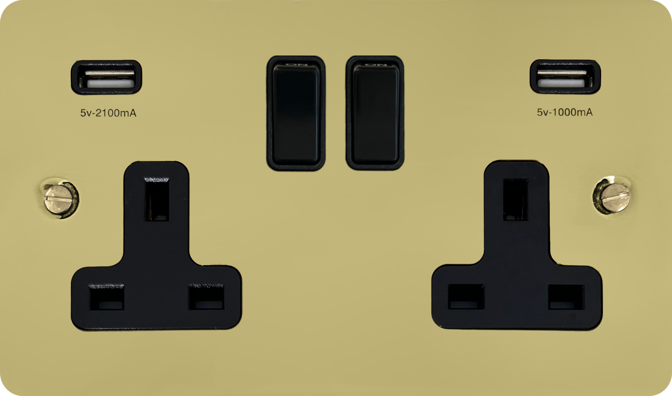 Flat Polished Brass Unlacquered Double Socket with USB (Black Switches) - G+H FBUL910B