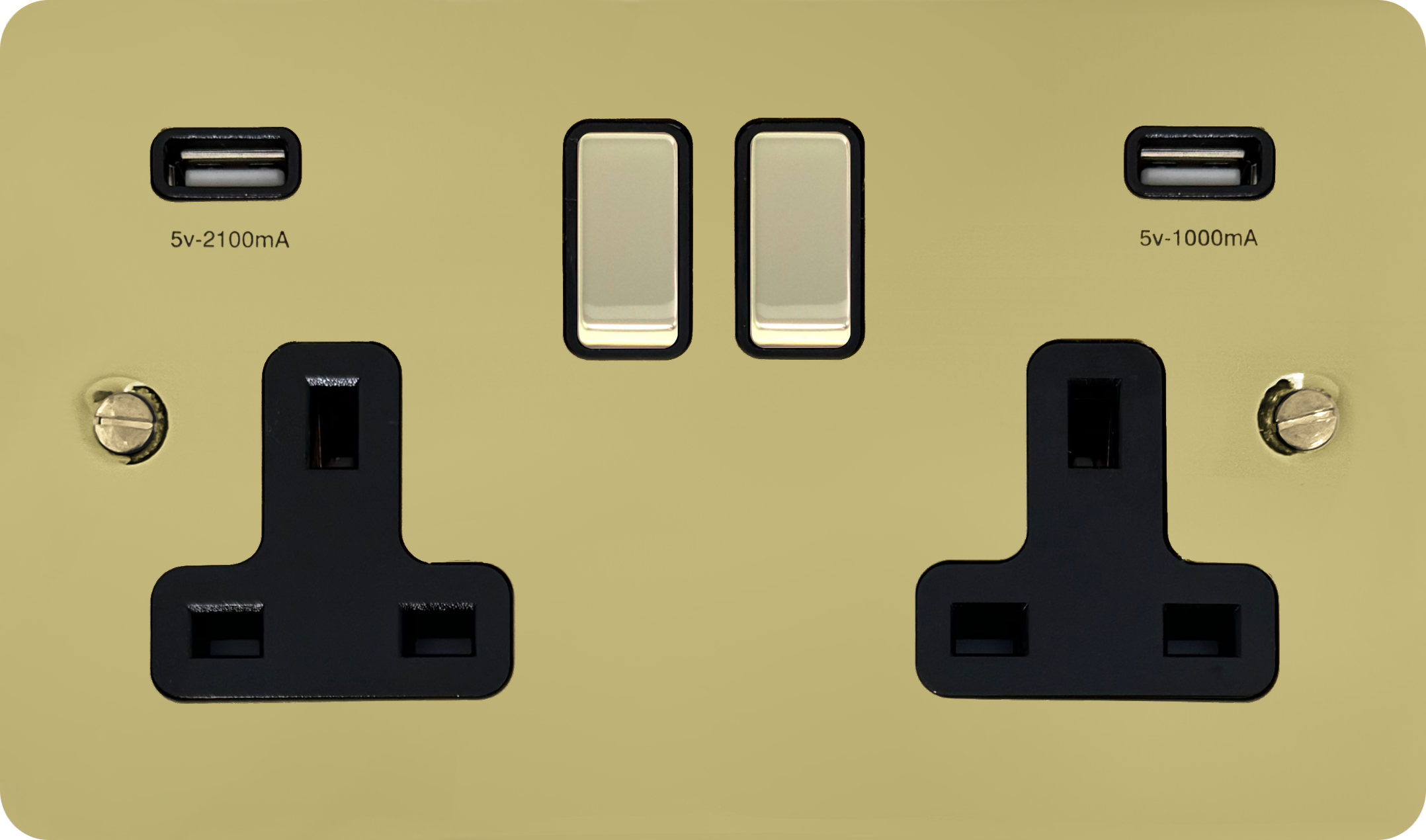 Flat Polished Brass Unlacquered Double Socket with USB (Brass Switches) - G+H FBUL3910