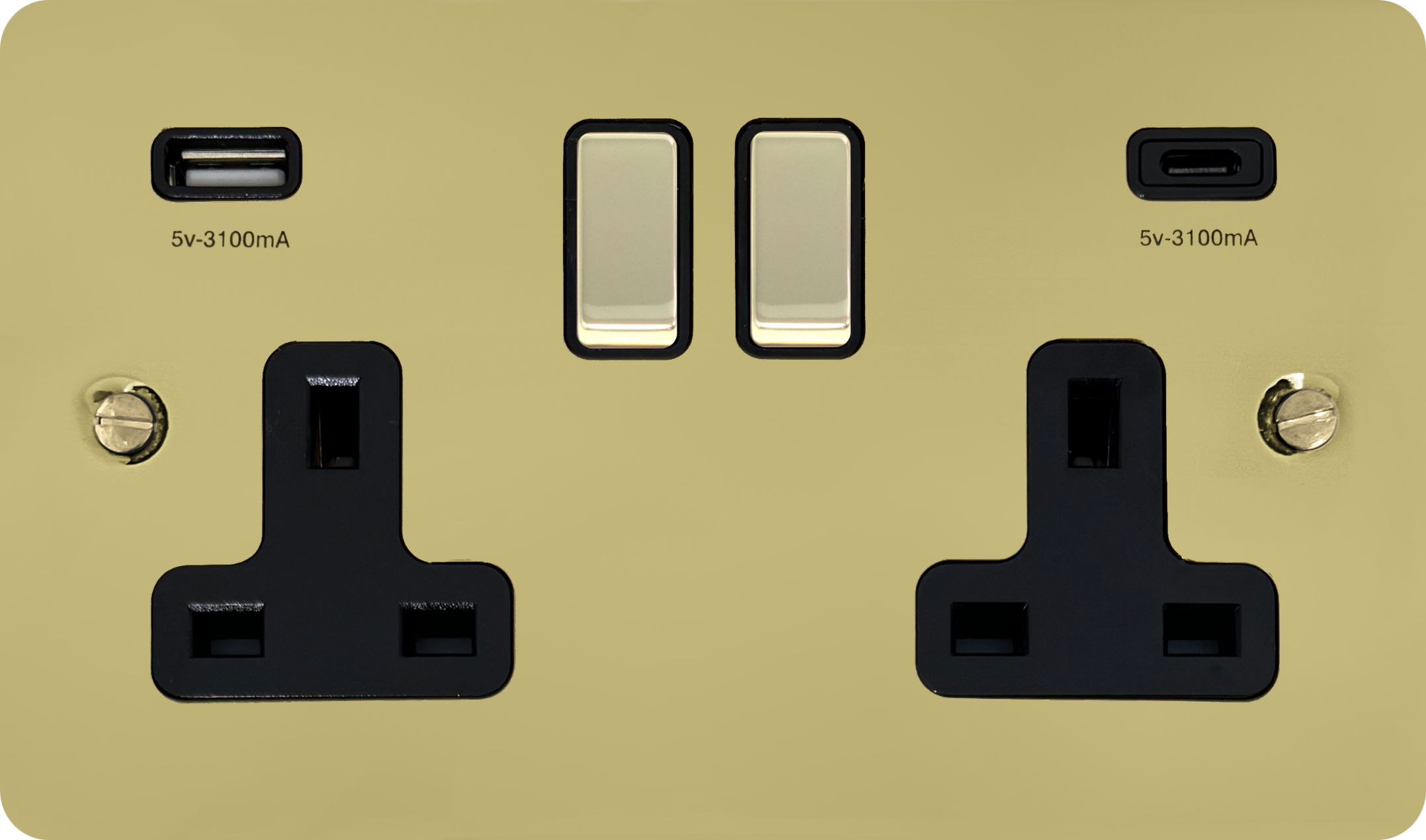 Flat Polished Brass Unlacquered Double Socket with USB (USB-A and USB-C/Black Insert Brass Switches) - G+H FBUL3911