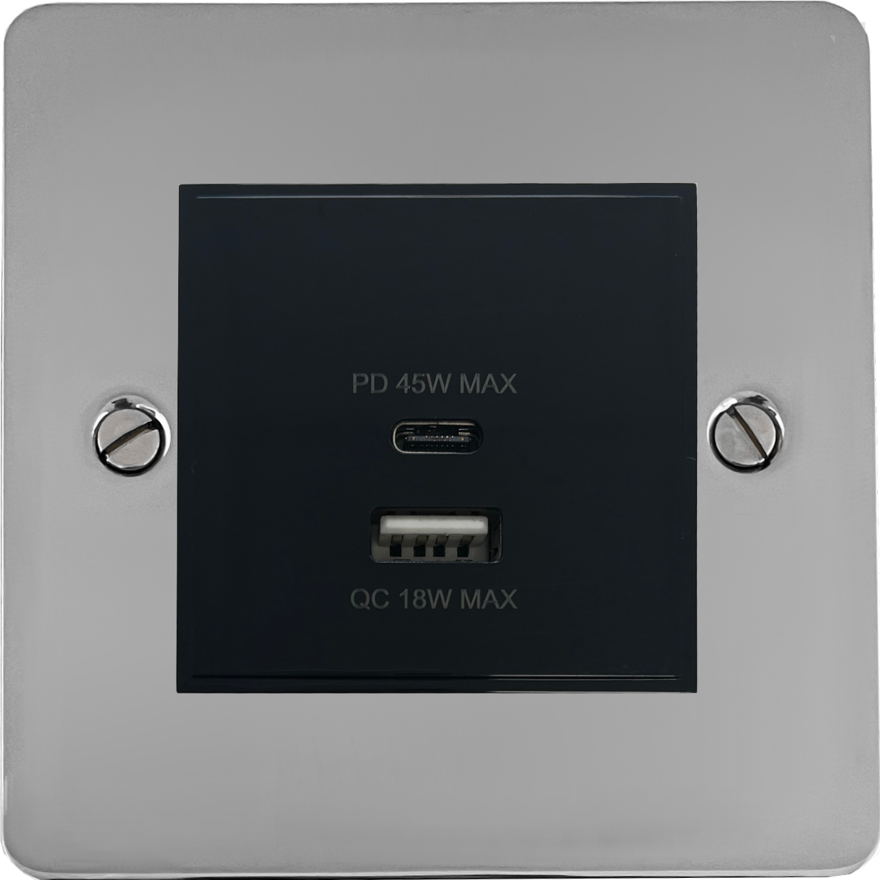 Flat Polished Chrome USB Charger (Dual USB A + C Quick Charge) (1 Gang/Black Insert) - G+H FC43B