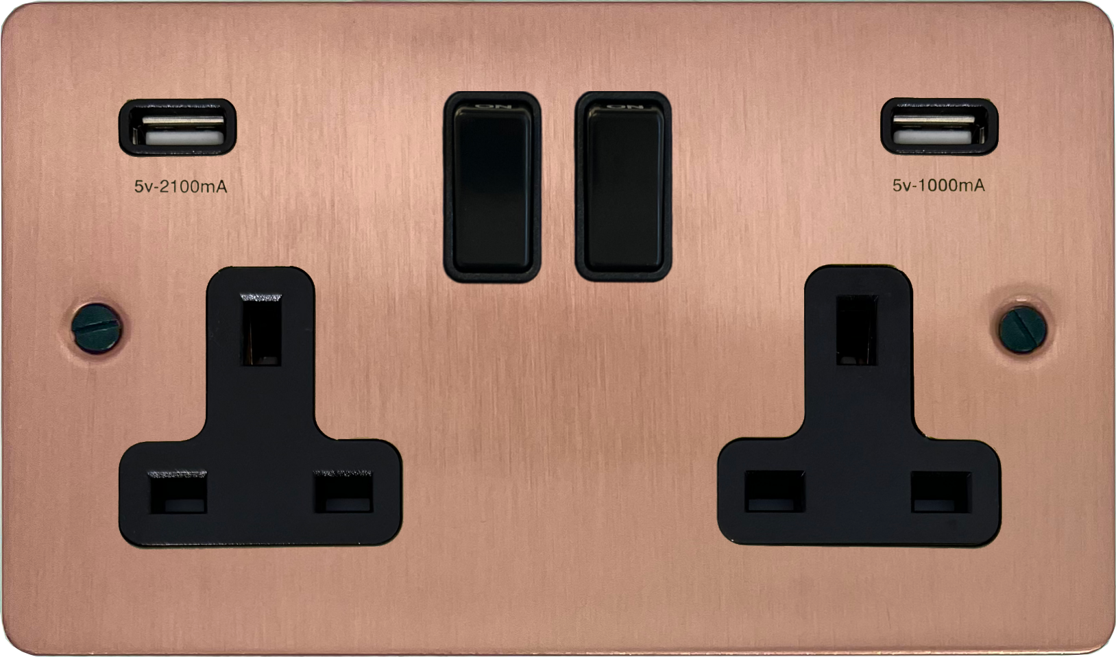 Flat Rose Gold Double Socket with USB (Black Switch) - G+H FRG910B