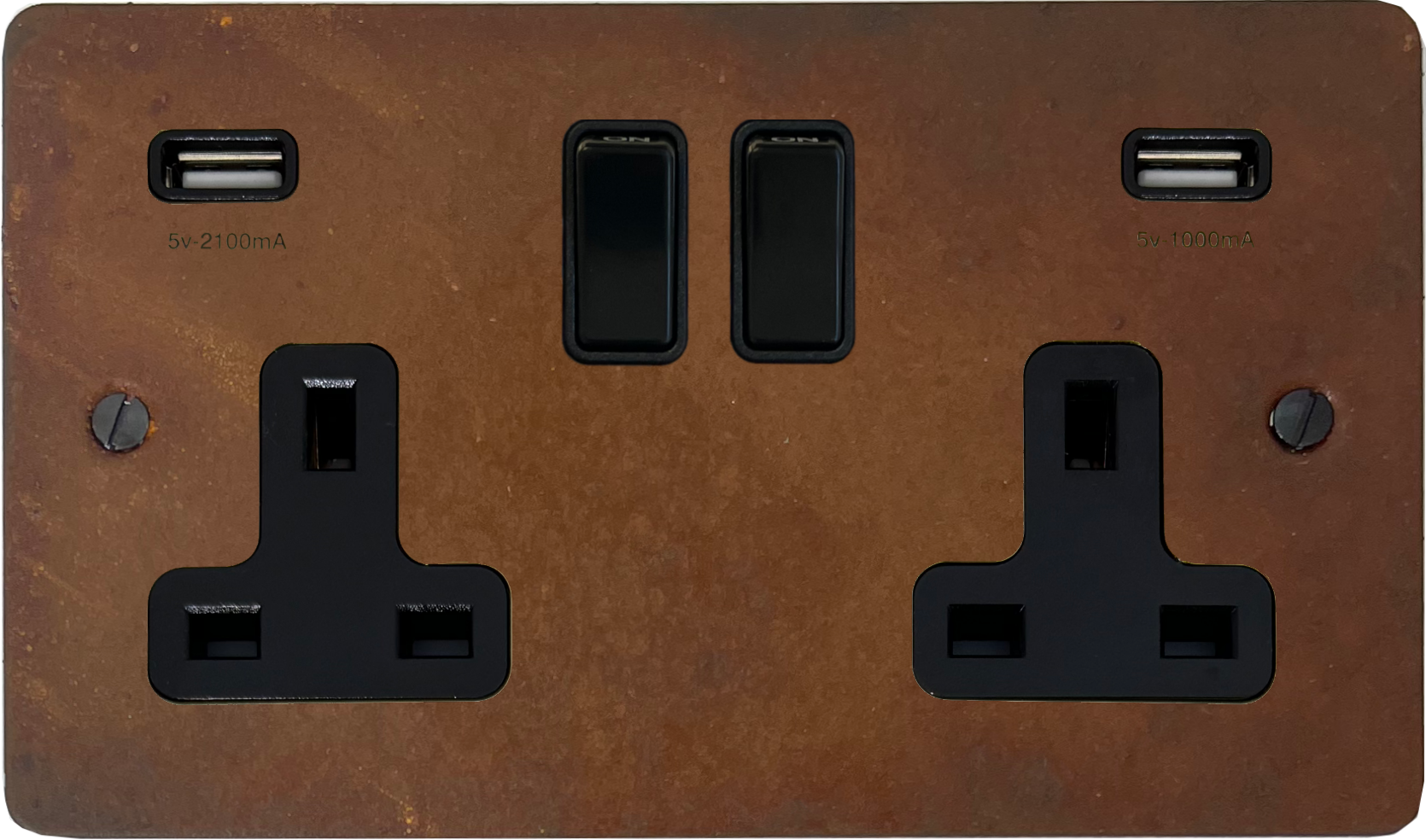 Flat Rust Double Socket with USB (Black Switches) - G+H FRT910B