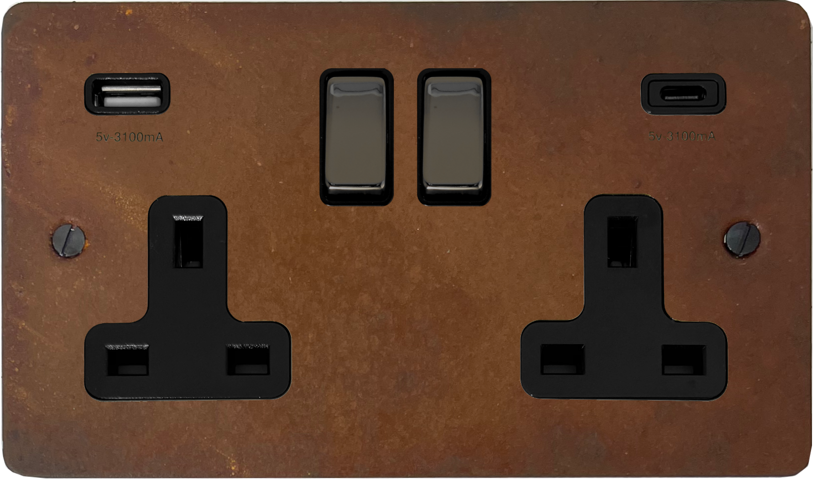 Flat Rust Double Socket with USB (USB-A and USB-C/Metal Switches) - G+H FRT3911