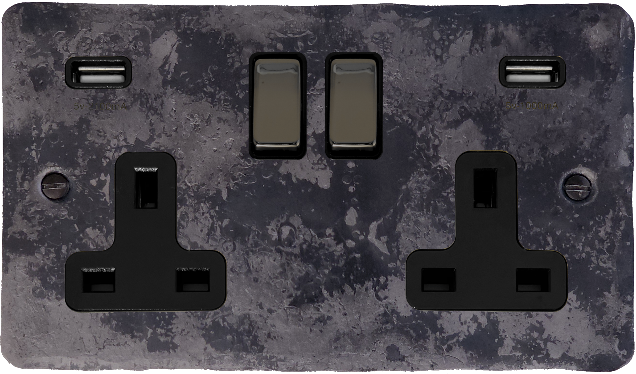 Flat Rustic Double Socket with USB (Black Nickel Switches) - G+H FR3910