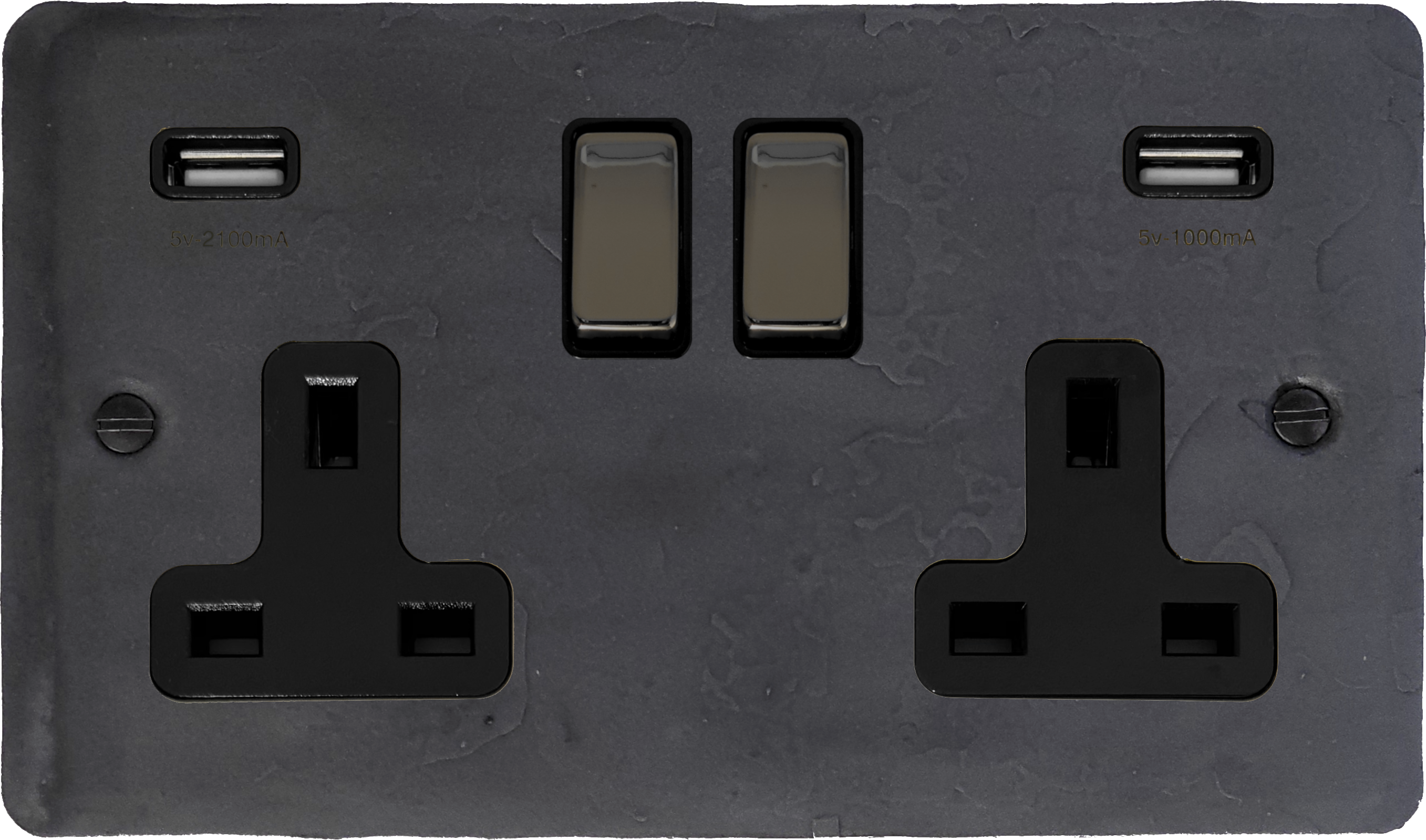 Flat Rustic Pewter Double Socket with USB (Black Nickel Switches) - G+H FRP3910-BN