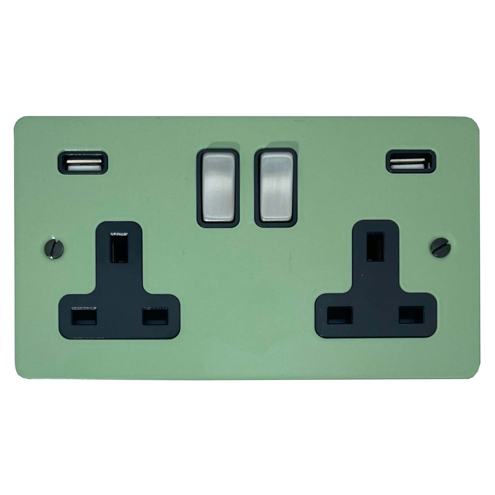 Flat Sage Green Double Socket with USB (Black Insert/Steel Switches) - G+H FSG3910