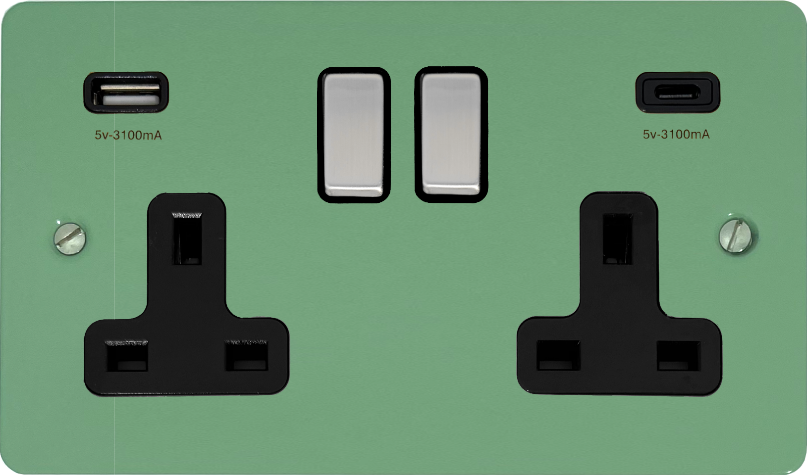 Flat Sage Green Double Socket with USB (USB-A and USB-C/Steel Switches/Black Inserts) - G+H FSG3911-SC