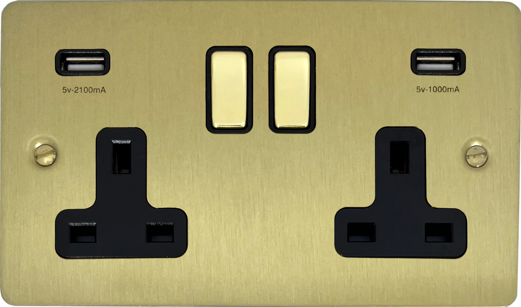 Flat Satin Brass Socket with USB (2 Gang/Polished Brass Switches) - G+H FSB3910