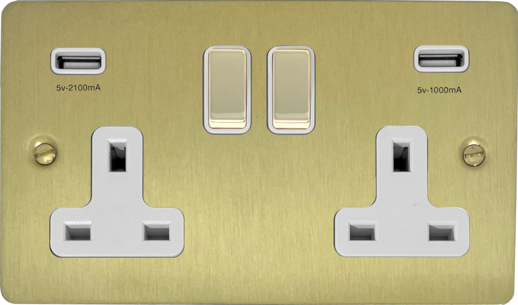 Flat Satin Brass Socket with USB (2 Gang/Polished Brass Switches/ White Inserts) - G+H FSB2910