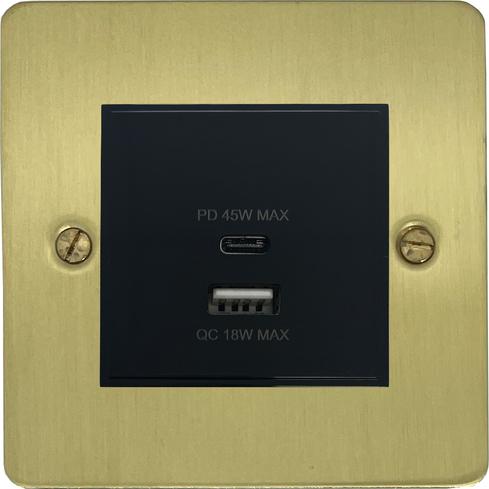 Flat Satin Brass USB Charger (Dual USB A + C Quick Charge) - G+H FSB43B