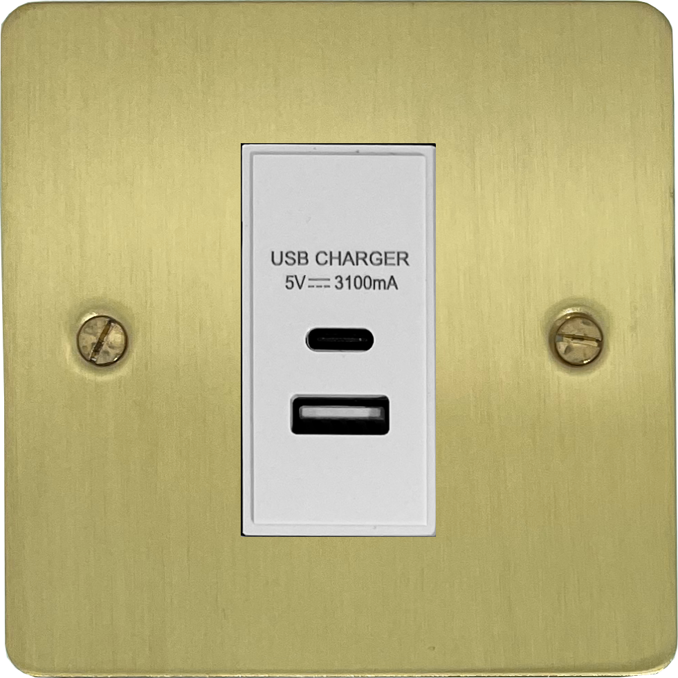 Flat Satin Brass USB Charger (USB-A and USB-C) (White Insert) - G+H FSB41W