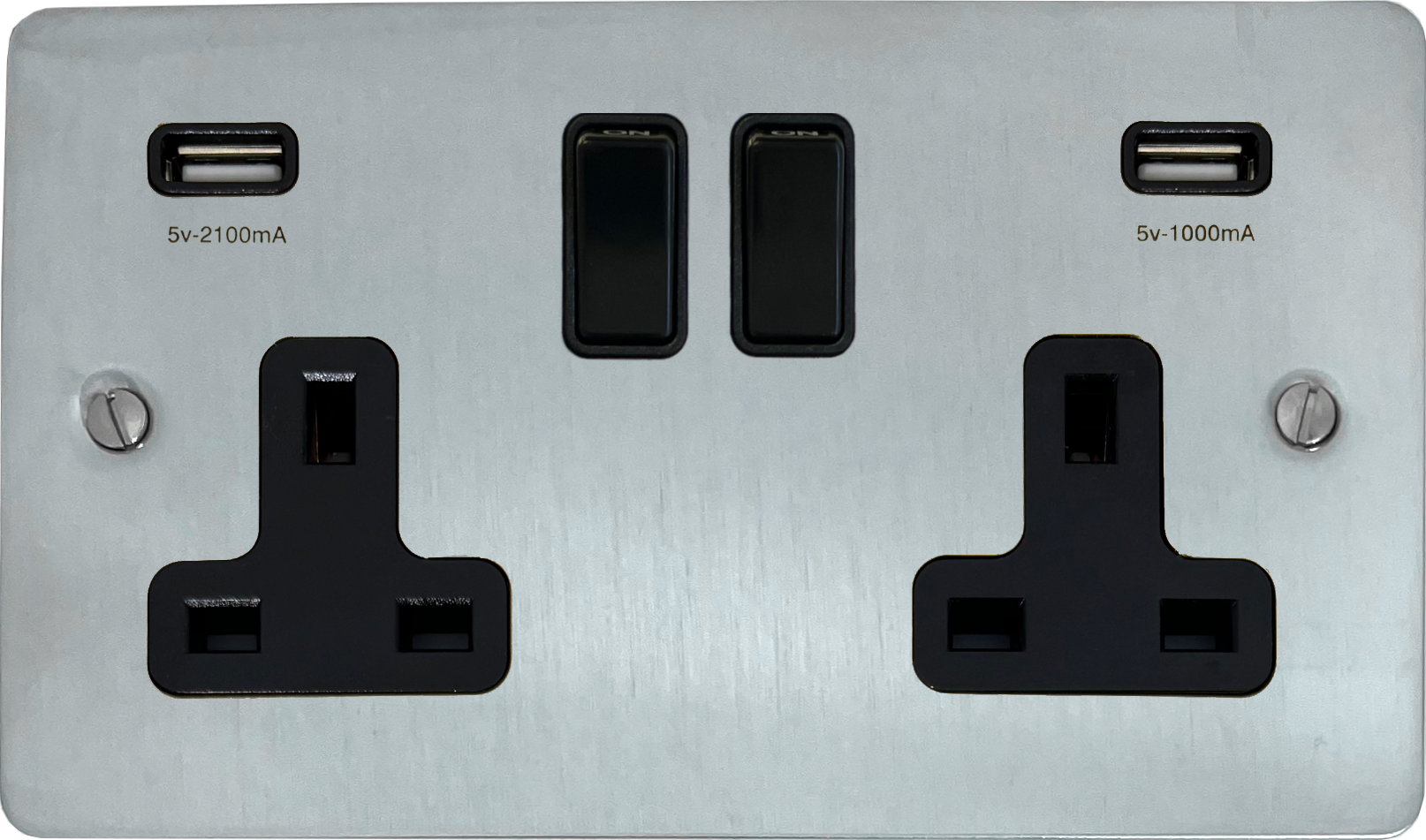 Flat Satin Chrome Double Socket with USB (Black Switch) - G+H FSC910B