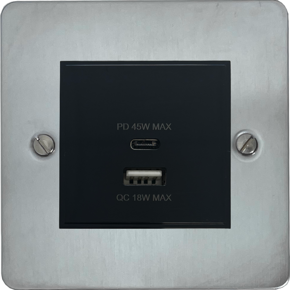 Flat Satin Chrome USB Charger (Dual USB A + C Quick Charge) (1 Gang/Black Insert) - G+H FSC43B