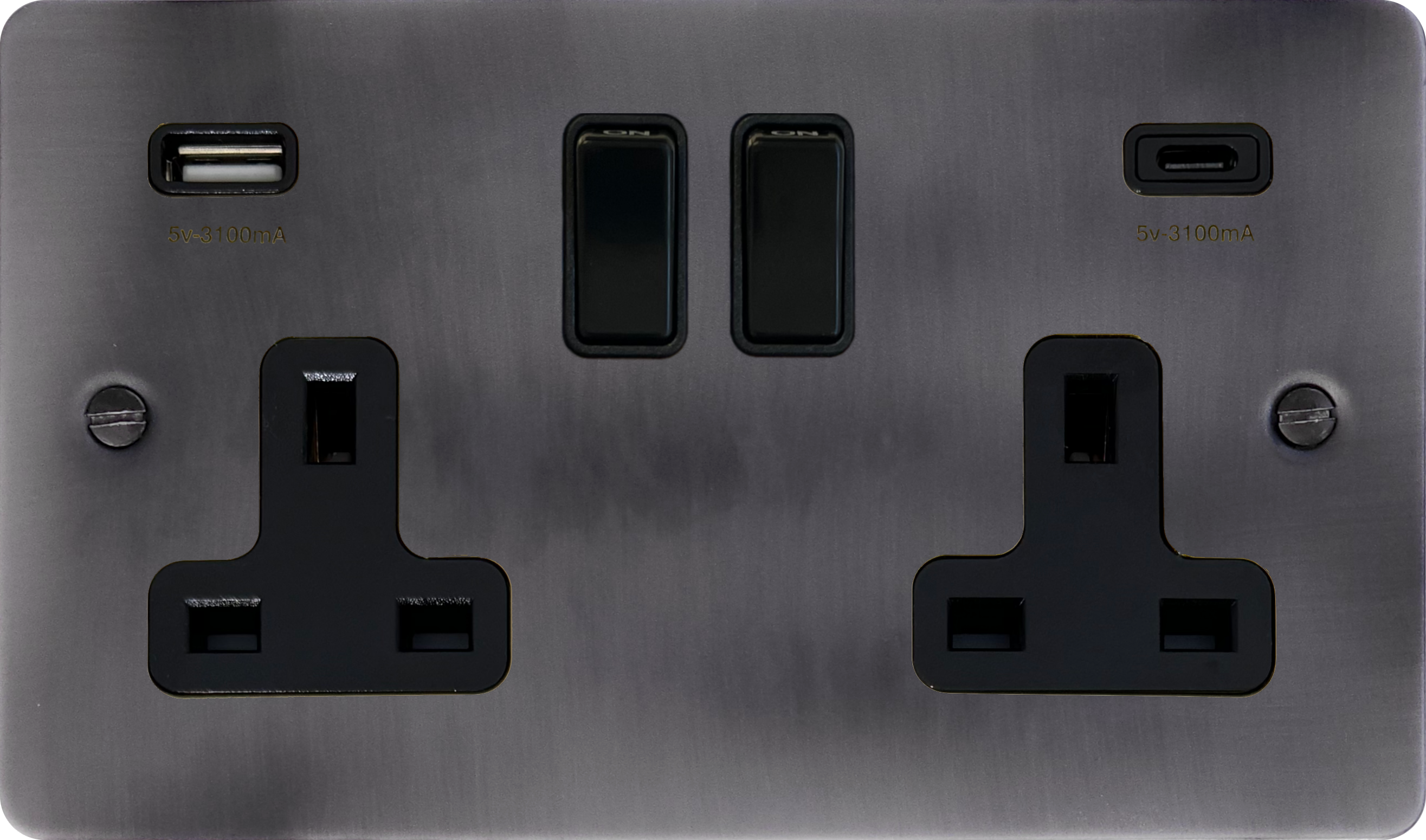 Flat Slate Effect Double Socket with USB (USB-A and USB-C/Black Switches) - G+H FSL911B