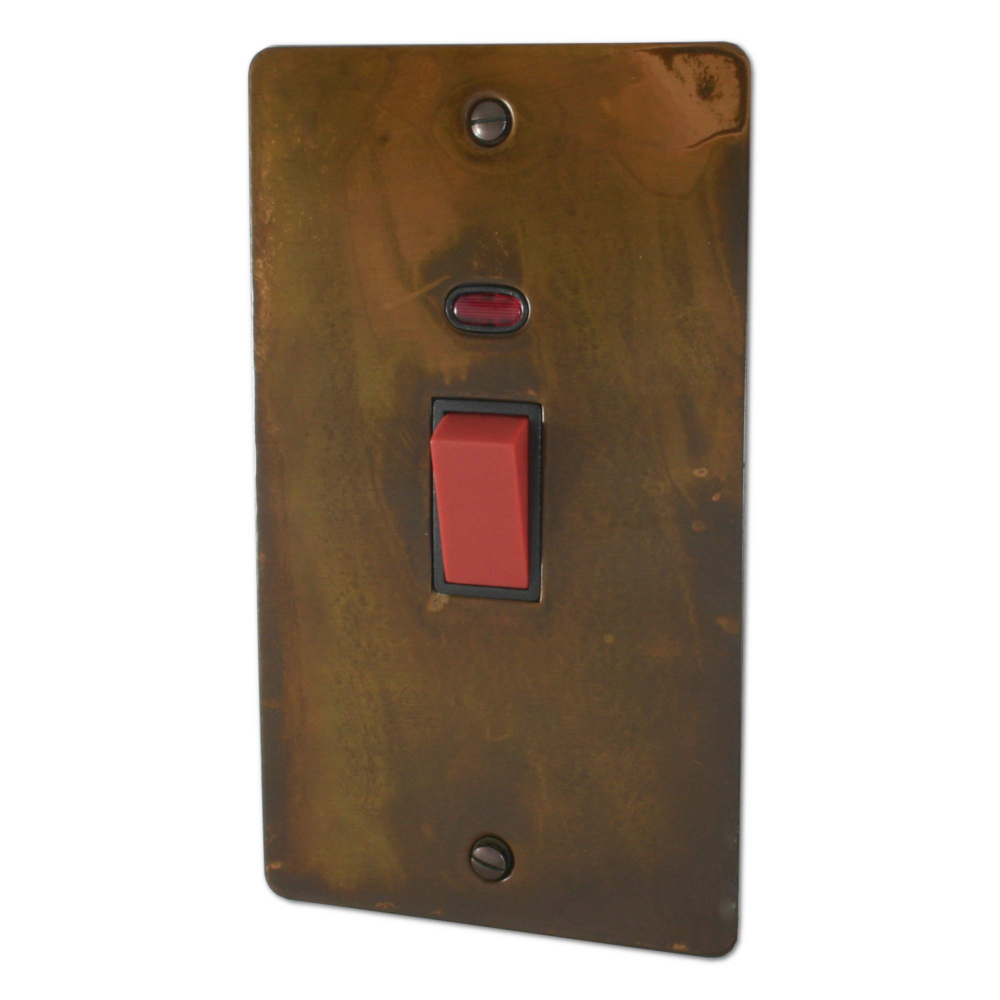 Flat Tarnished Copper 45A DP Switch with Neon (Black Insert/Red Switch/Vertical Plate) - G+H FTC28B