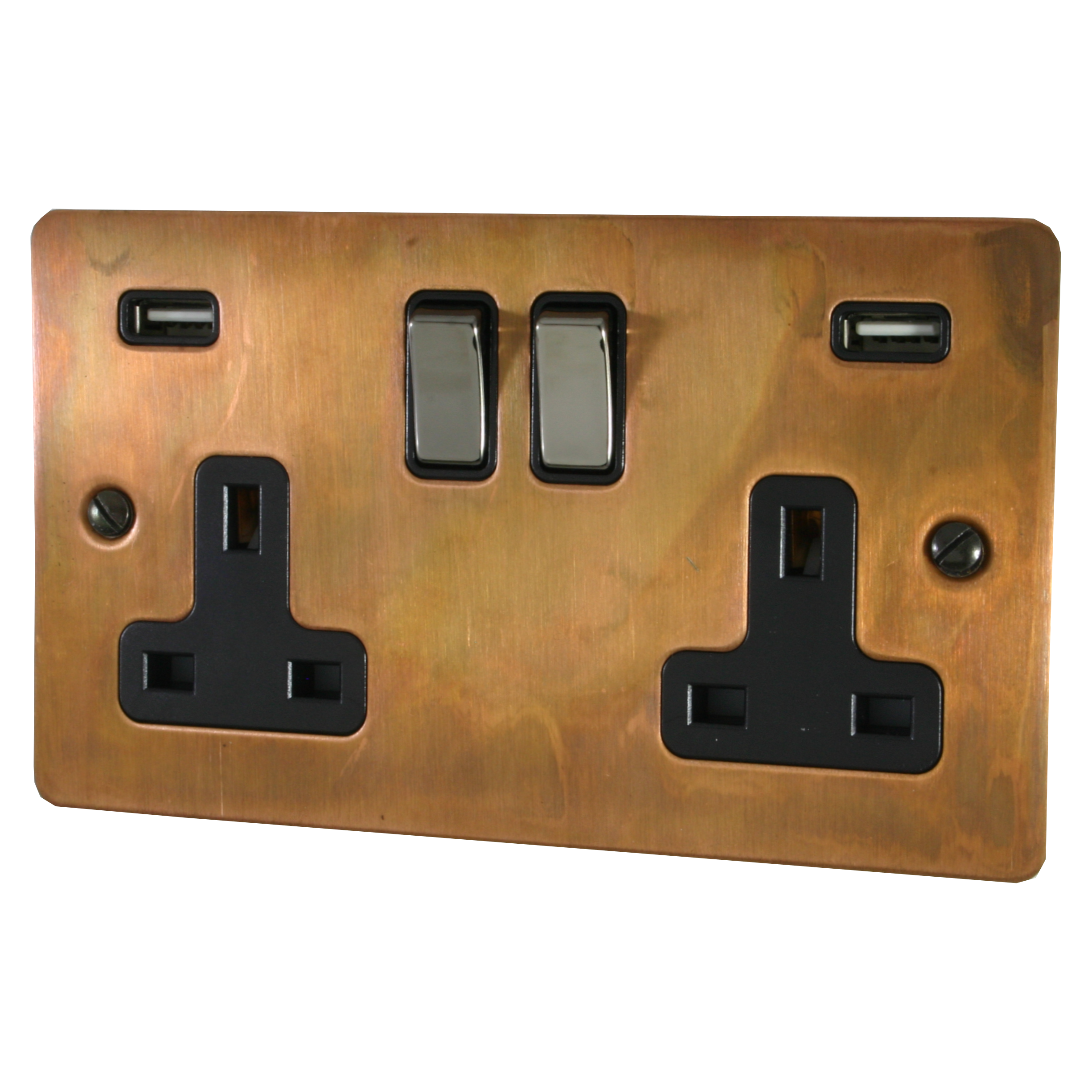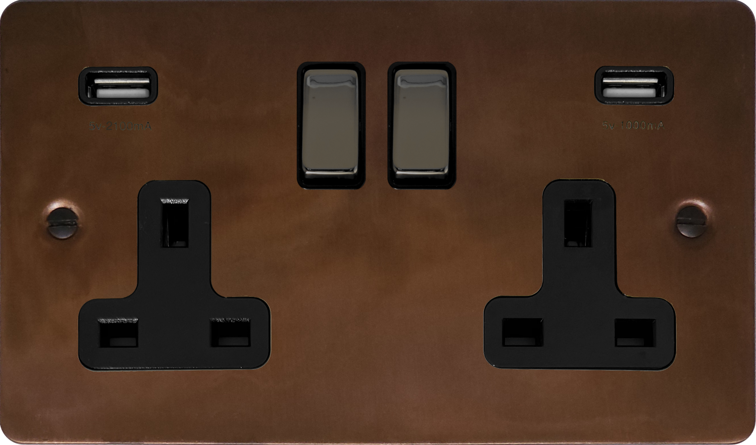 Flat Tarnished Copper Double Socket with USB (Black Nickel Switch) - G+H FTC3910
