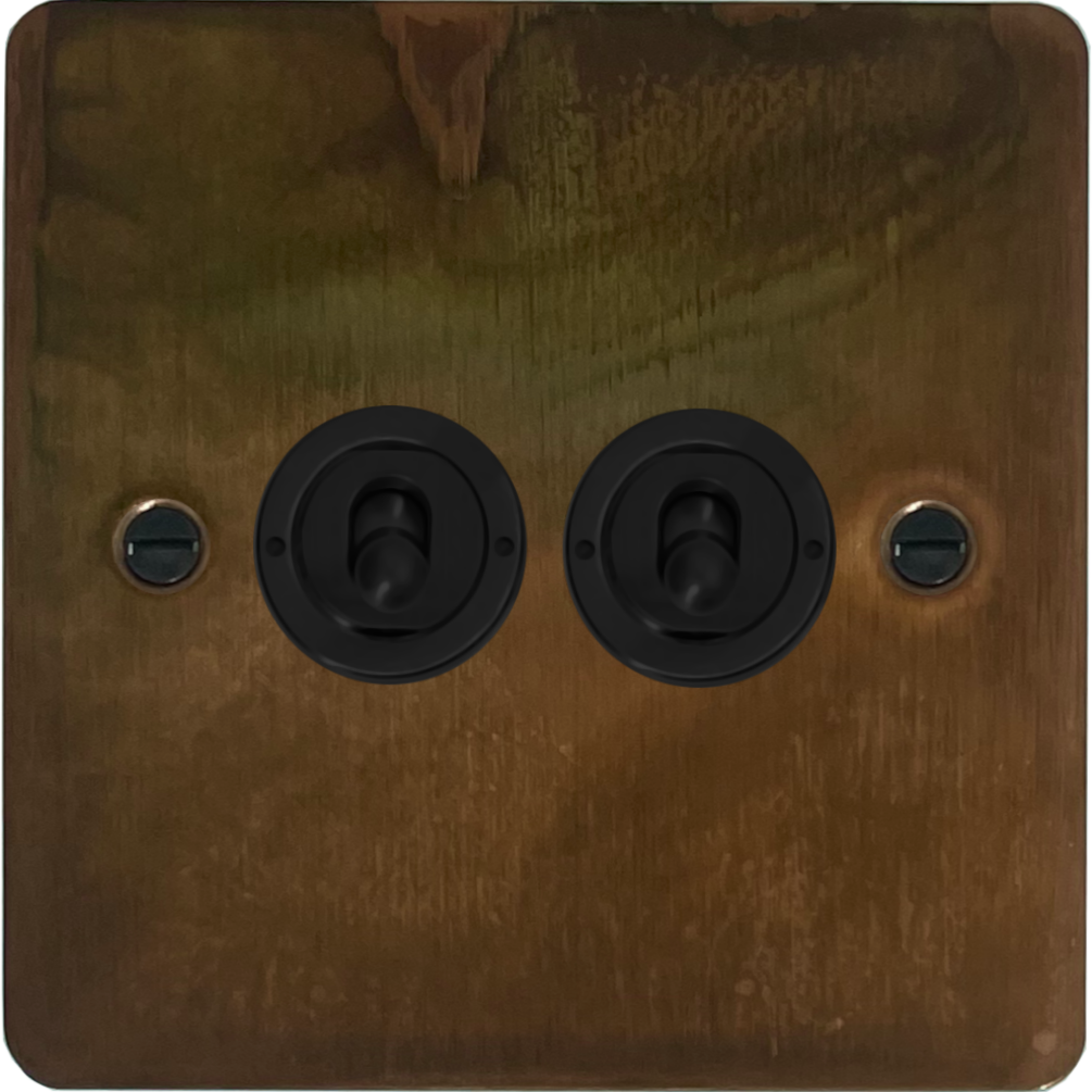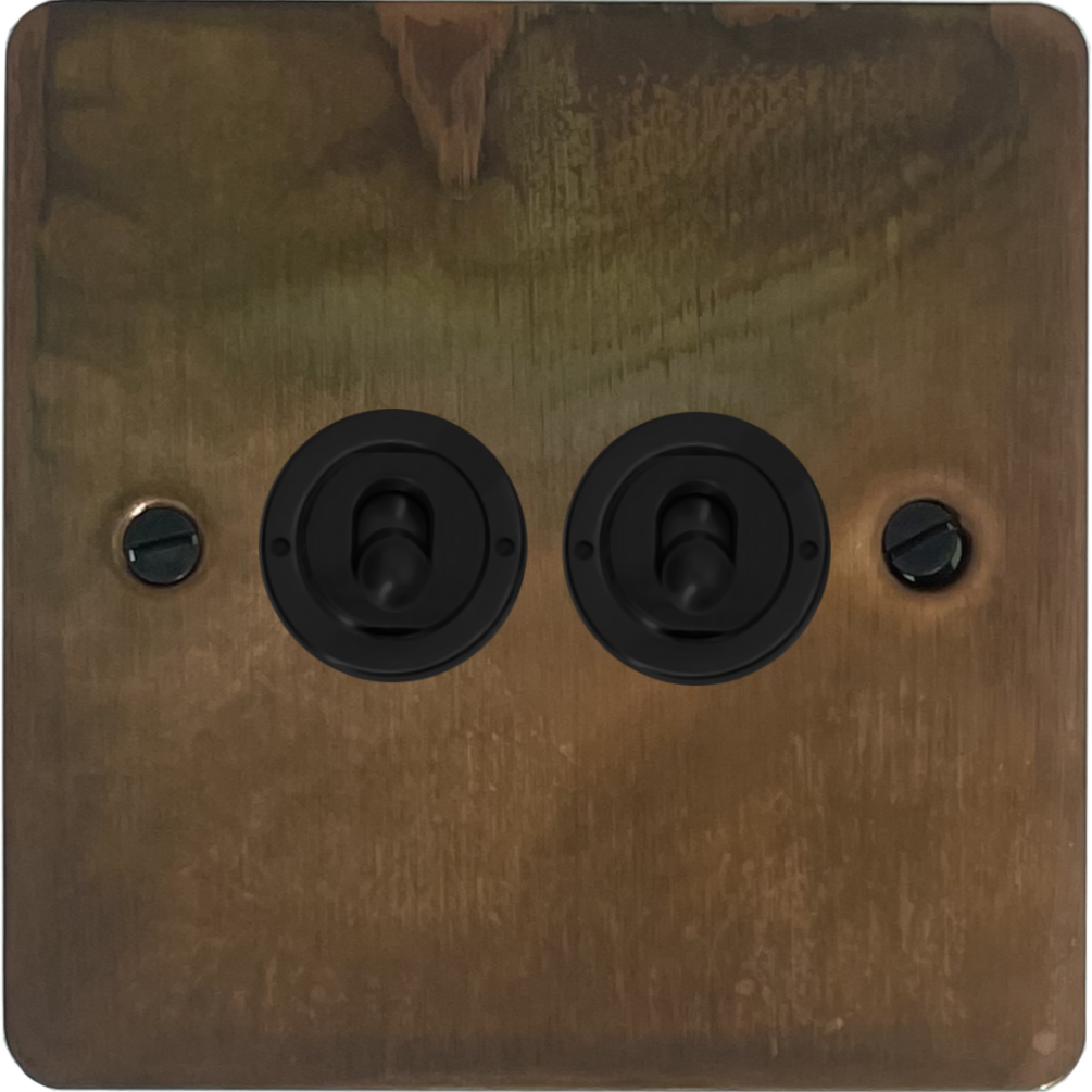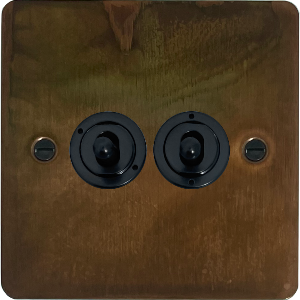 Flat Tarnished Copper Toggle Switch (2 Gang/Matt Black Toggles) - G+H FTC382-FBK