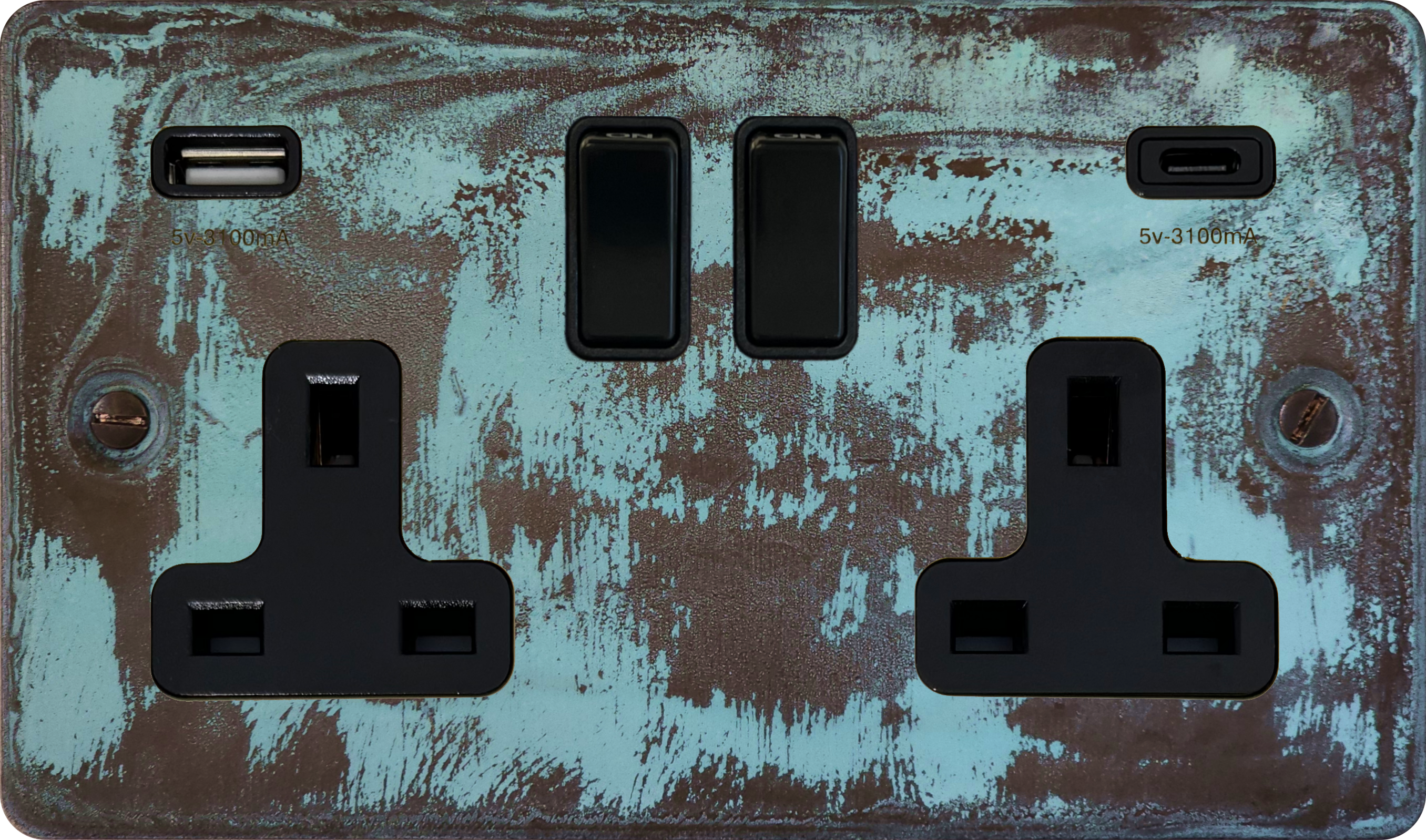 Flat Verdigris Socket Double Socket (USB-A and USB-C/Black Switches) - G+H FV911B