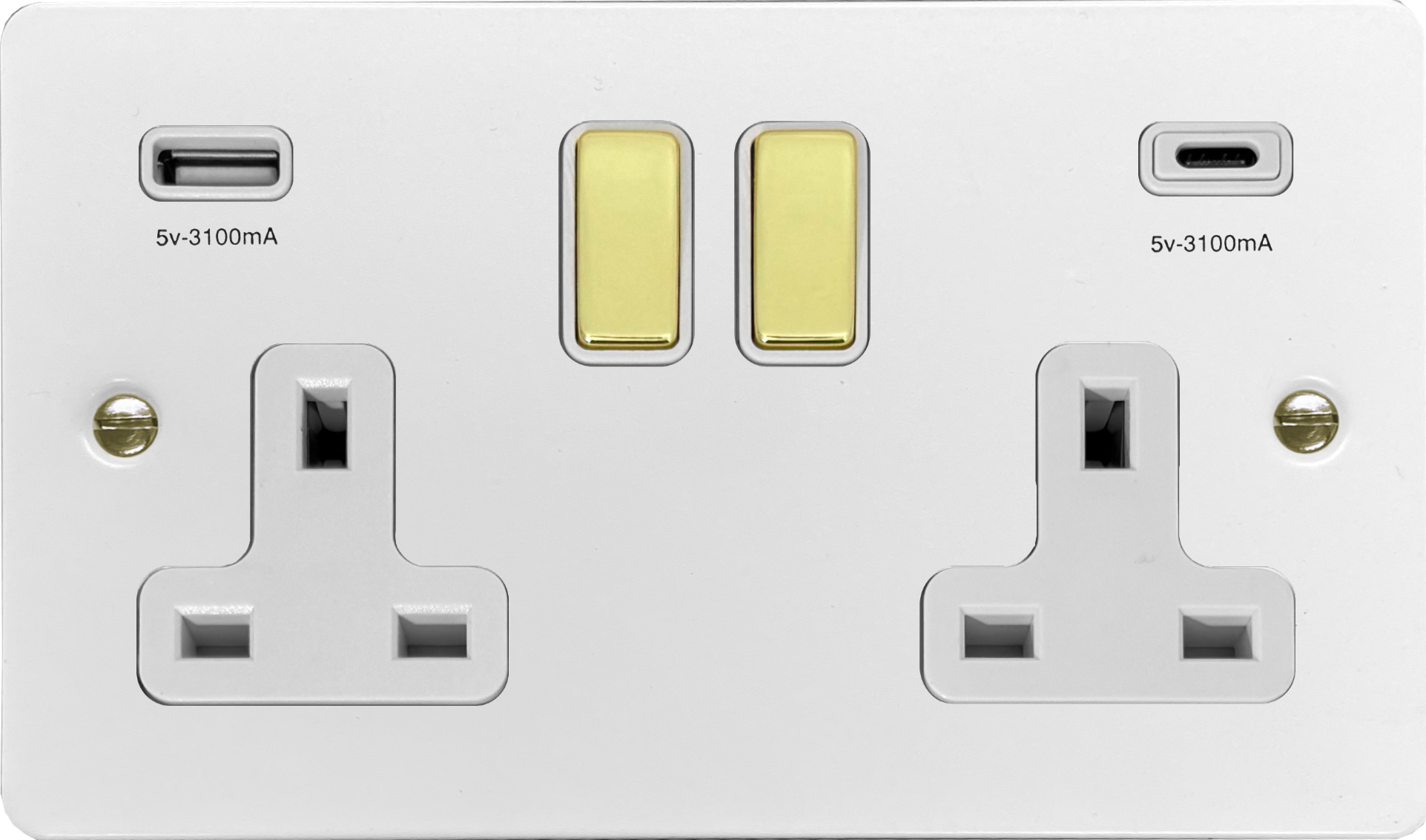 Flat White Socket with USB (USB-A and USB-C/White Insert/Polished Brass Switches)