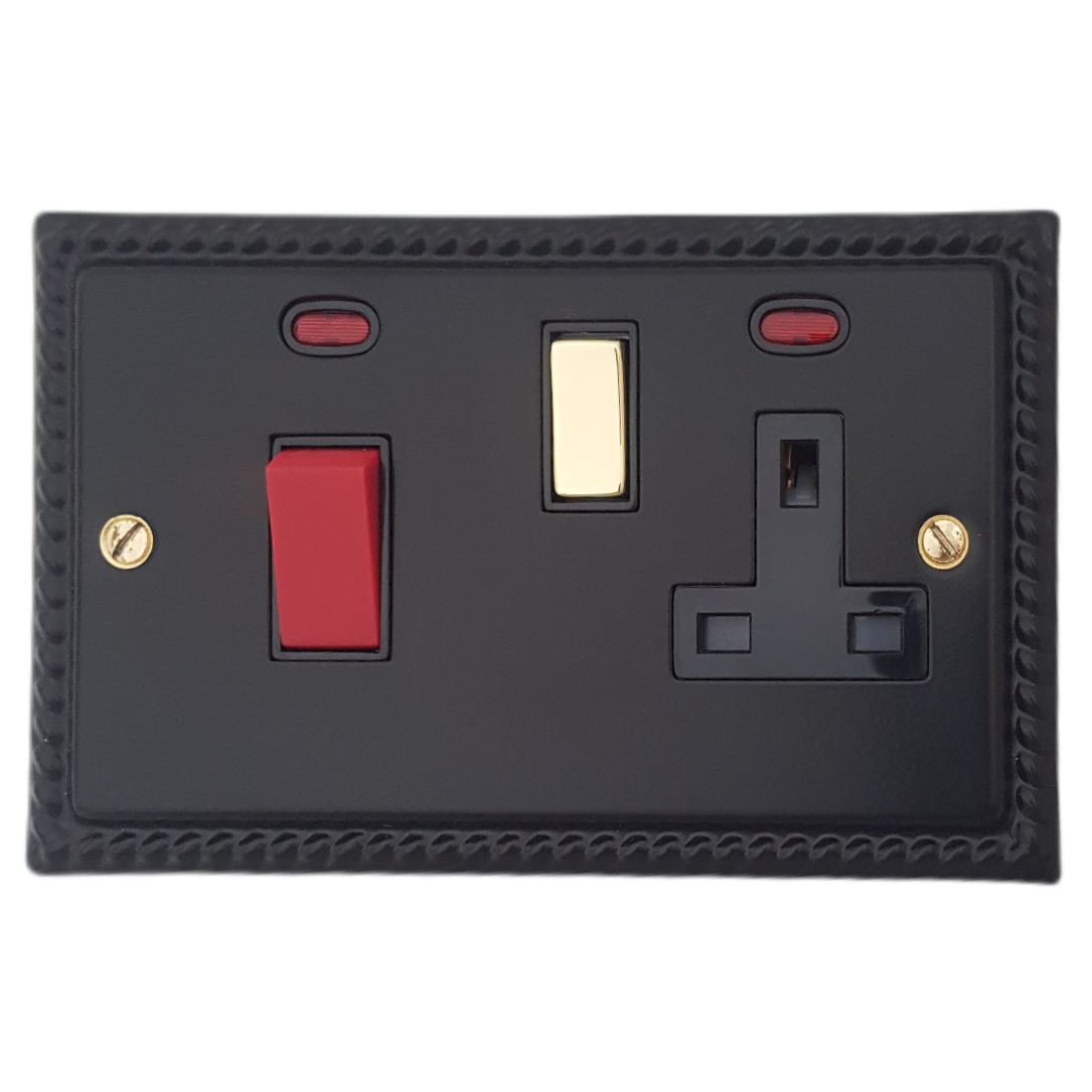 Georgian Black Cooker Switch with Socket (Black inserts/Red/Polished Brass Switch)