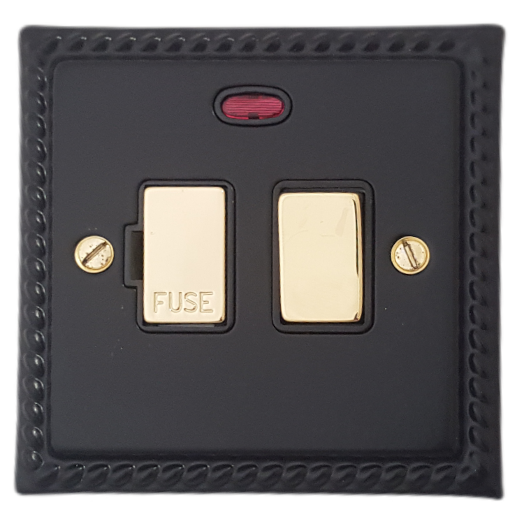 Georgian Black Switched Fused Spur with Neon (Black insert/Polished Brass Switch)