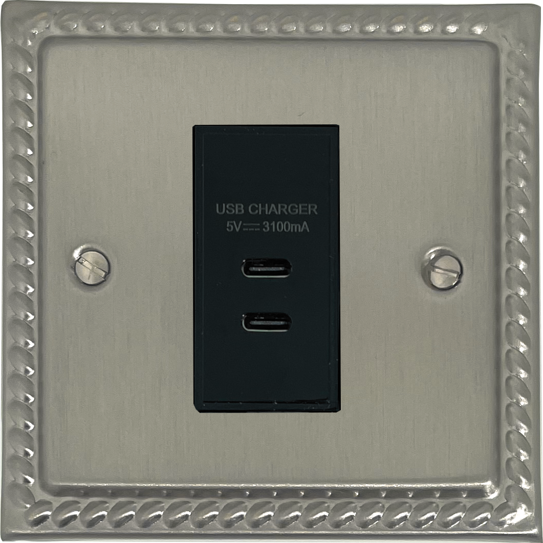 Georgian Satin Nickel USB Charger (2x USB-C) (1 Gang/Black Insert) - G+H MSN42B