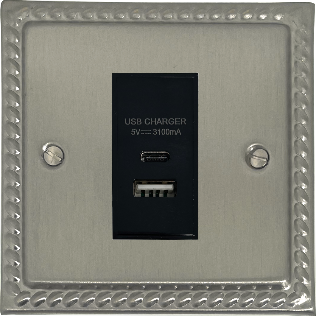 Georgian Satin Nickel USB Charger (USB-A and USB-C) (1 Gang/Black Insert) - G+H MSN41B