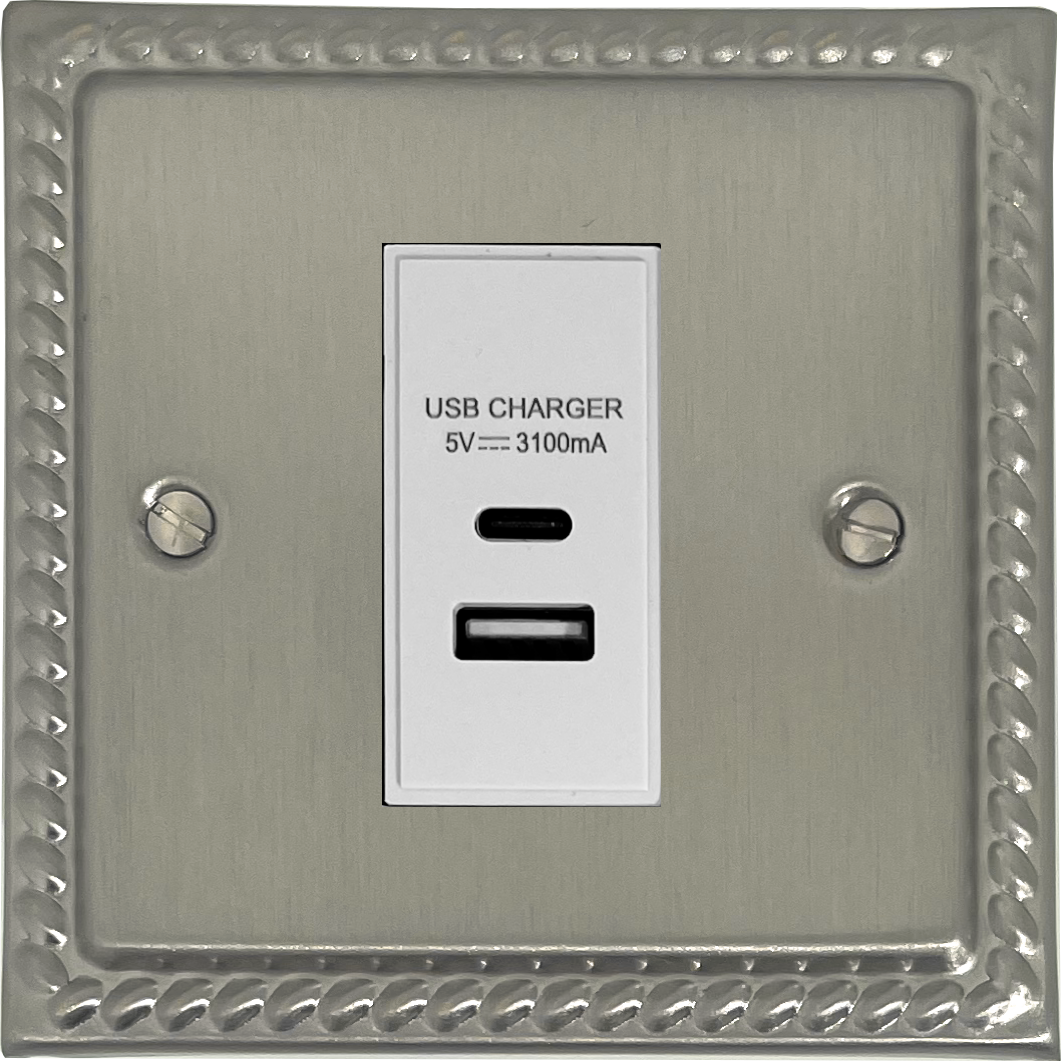 Georgian Satin Nickel USB Charger (USB-A and USB-C) (1 Gang/White Insert) - G+H MSN41W