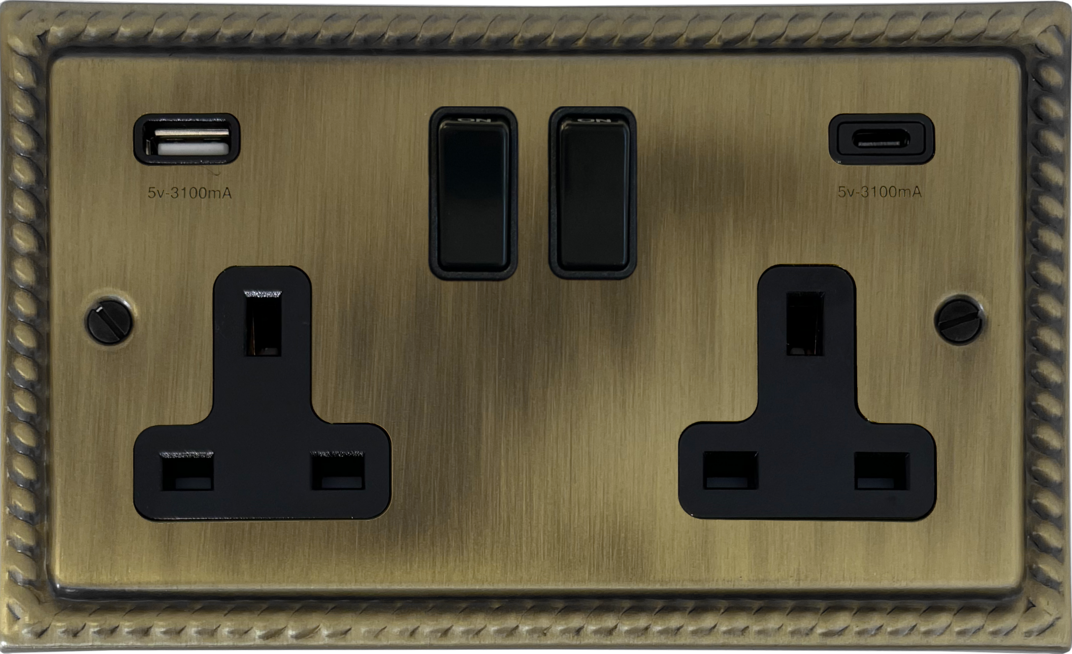 Monarch Light Antique Brass Socket with USB (2 Gang/USB-A and USB-C/Black Switches) - G+H MLAB911B