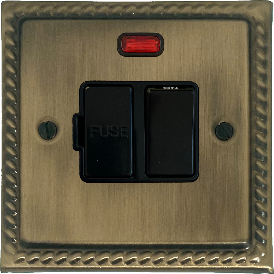 Monarch Light Antique Brass Switched Fused Spur with Neon (Black Switches) - G+H MLAB27B