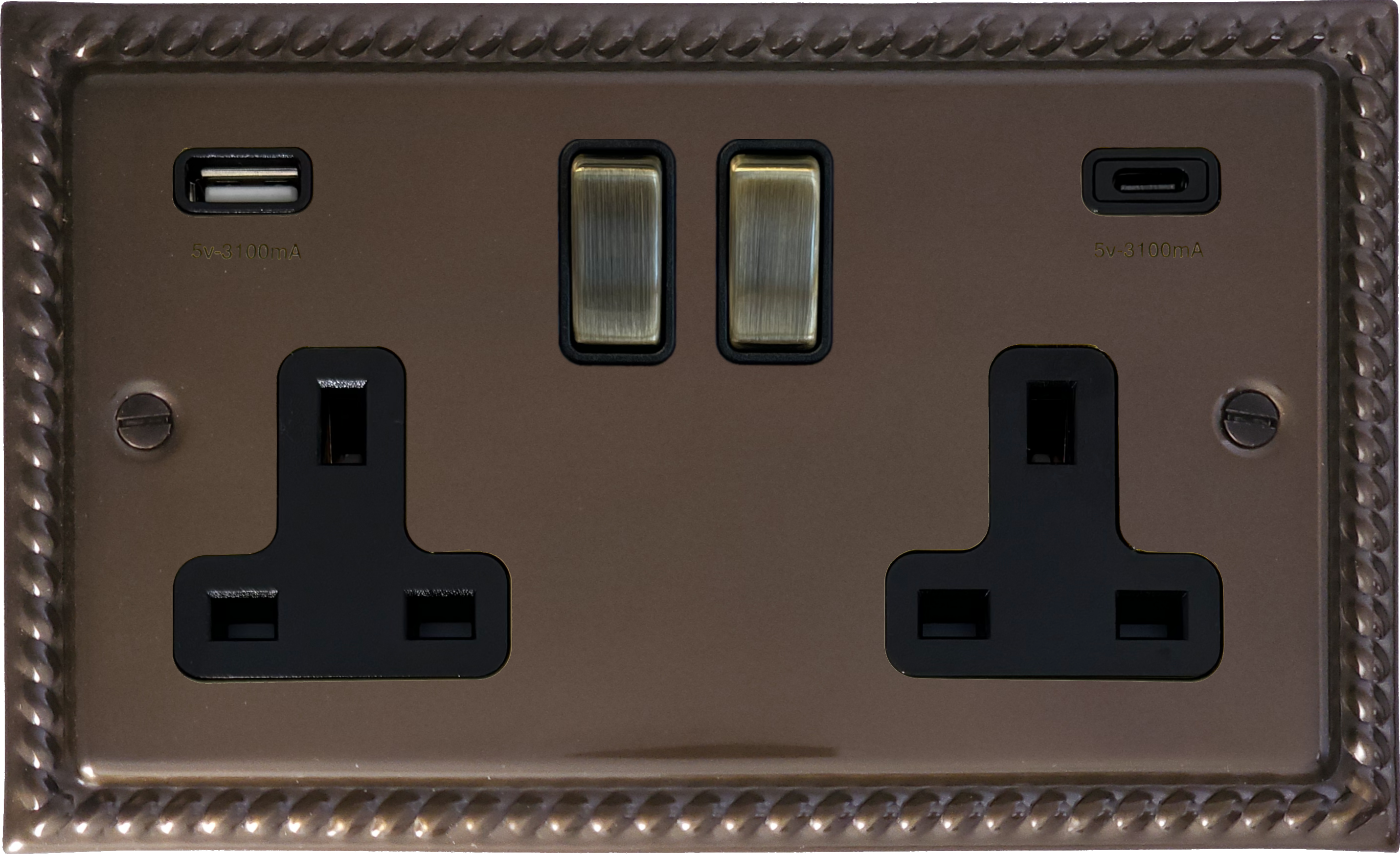 Monarch Medium Bronze Double Socket (2 Gang/USB-A and USB-C/Antique Brass Switches)